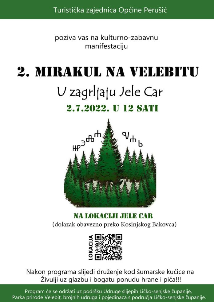 Turistička zajednica Općine Perušić, u suradnji s Udrugom slijepih Ličko-senjske županije i Parkom prirode Velebit, poziva vas na kulturno-zabavnu manifestaciju 2. Mirakul na Velebitu – „U zagrljaju Jele Car“, koja će se održati na lokaciji Jele Car iznad Kosinjskog Bakovca u subotu 2. 7. 2022. godine s početkom u 12 sati.