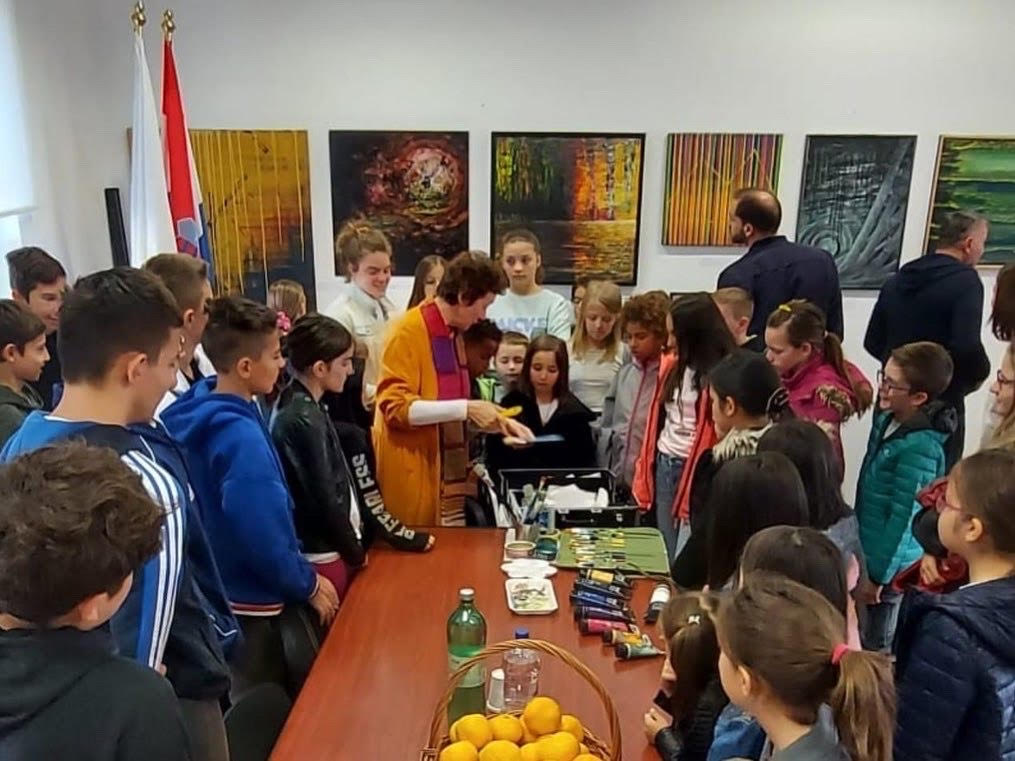 Izložbu su posjetili i osnovnoškolci iz Lovinca te su sudjelovali u malom kvizu koji je za njih pripremila sama autorica, a najbolji su osvojili zanimljive nagrade, između ostaloga slike Marije Hećimović.