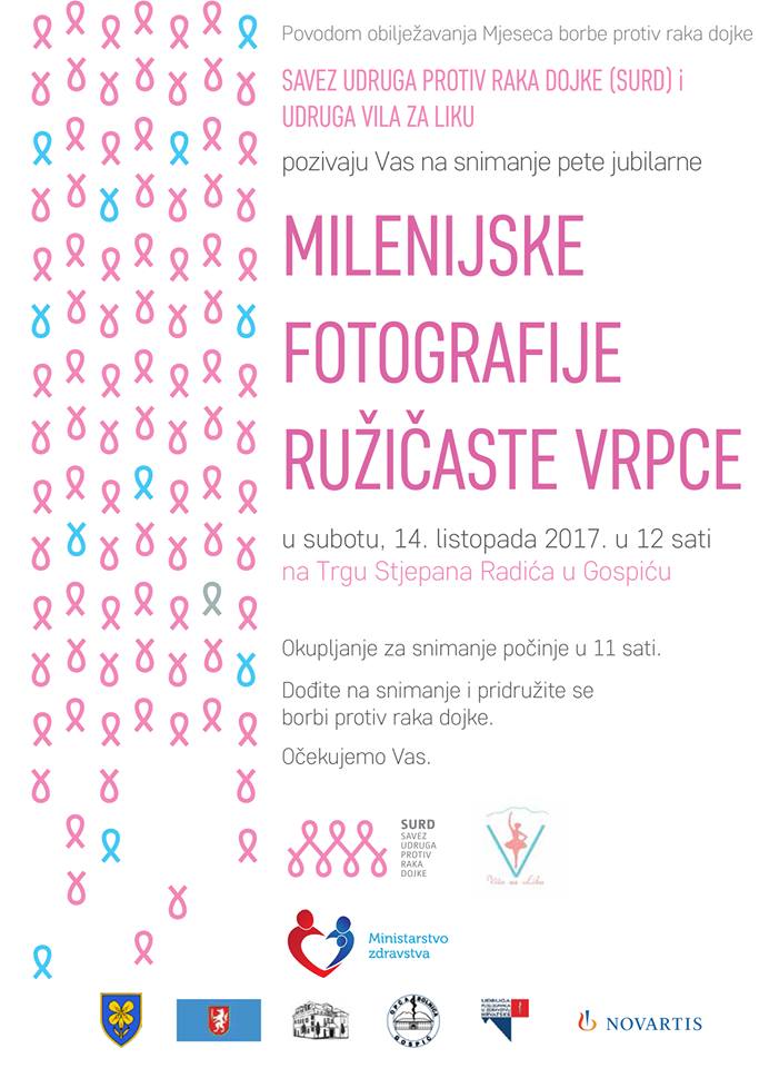 Savez udruga protiv raka dojke (SURD) i udruga Vila za Liku organiziraju snimanje fotografije Milenijske ružičaste vrpce u Gospiću, 14. listopada 2017. povodom Međunarodnog mjeseca protiv raka dojke. Oboljele i liječene žene iz cijele Hrvatske će zajedno s građankama i građanima Gospića svojim tijelima formirati ružičastu vrpcu koju će snimiti „milenijski“ fotograf Šime Strikoman. Akcija se održava pod pokroviteljstvom Ministarstva zdravstva, Ličko-senjske županije, Grada Gospića i uz podršku Zavoda za javno zdravstvo Ličko-senjske županije, Opće bolnice Gospić, Udruge poslodavaca u zdravstvu Hrvatke i tvrtke Novartis.