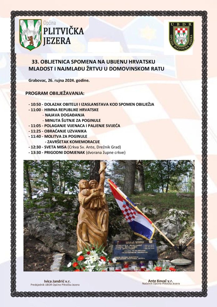 Home Kultura 33. obljetnica spomena na ubijenu Hrvatsku mladost i najmlađu žrtvu u domovinskom... KulturaPlitvička jezeravijesti 33. obljetnica spomena na ubijenu Hrvatsku mladost i najmlađu žrtvu u domovinskom ratu By Nikola Mraović - 25 rujna, 2024 0 Facebook U četvrtak 26.o9.2024. godine obilježavamo 33. obljetnicu spomena na ubijenu hrvatsku mladost i najmlađu žrtvu u Domovinskom ratu. Predsjednik UBDR općine Plitvička Jezera Ivica Jandrić RELATED ARTICLESMORE FROM AUTHOR Odgovor saborskog zastupnika Zvonimira Troskota gradonačelniku Gospića Darku Milinoviću Otkrivene lokacije na kojima se ove godine vozi svjetski spektakl WRC Croatia Rally Demantij Milinovića: „Gospodine Troskot pločice u ramenu je lako mijenjati, ali opasne su one u glavi“