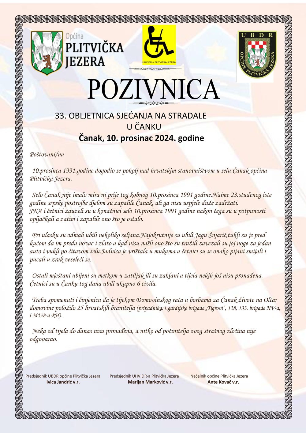Home Gospić 33. obljetnice sjećanja na stradale u Čanku GospićKulturaPlitvička jezeravijesti 33. obljetnice sjećanja na stradale u Čanku By Nikola Mraović - 2 prosinca, 2024 0 Facebook Gs Press RELATED ARTICLESMORE FROM AUTHOR Odgovor saborskog zastupnika Zvonimira Troskota gradonačelniku Gospića Darku Milinoviću Otkrivene lokacije na kojima se ove godine vozi svjetski spektakl WRC Croatia Rally Demantij Milinovića: „Gospodine Troskot pločice u ramenu je lako mijenjati, ali opasne su one u glavi“ Predstavnici Savjeta mladih LSŽ posjetili OB Gospić povodom Svjetskog dana bolesnika Biskup Marko Medo predvodio misno slavlje i blagoslovio Opću bolnicu Gospić