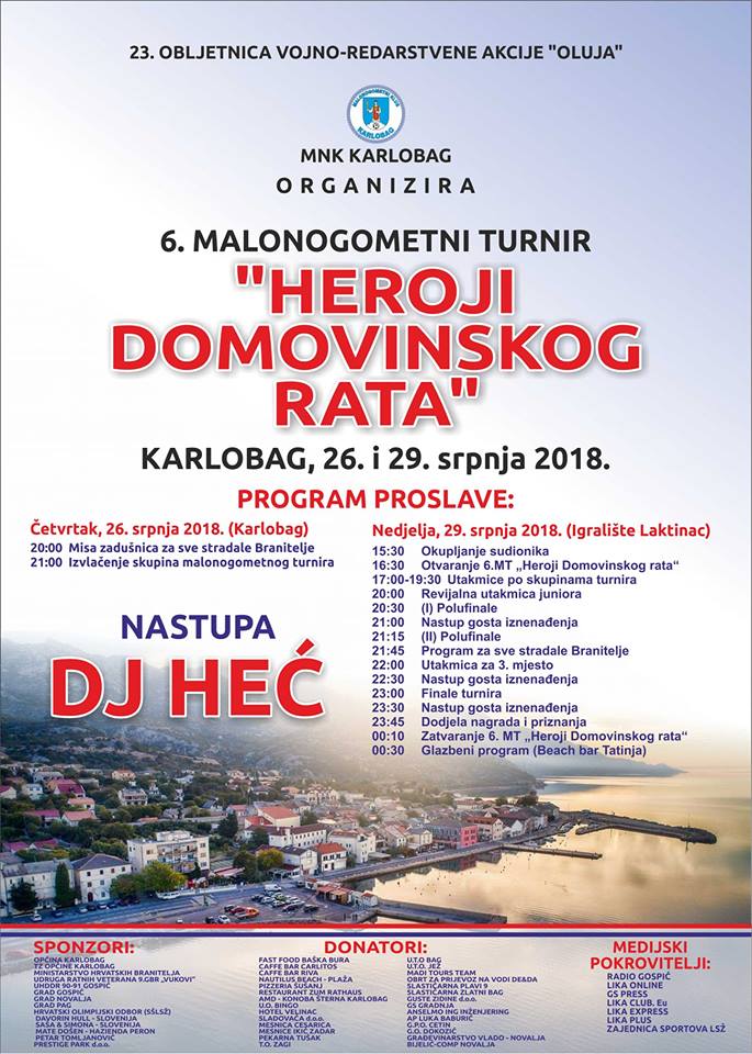 Malonogometni Klub Karlobag vas sve zajedno poziva u nedjelju 29. srpnja s početkom u 16:00 sati u Karlobagu na igralištu Laktinac gdje će se održati tradicionalni 6.MT ” Heroji Domovinskog rata” sa kojim ćemo i ove godine obilježiti 23. obljetnicu od završetka vojno- redarstvene akcije Oluja.