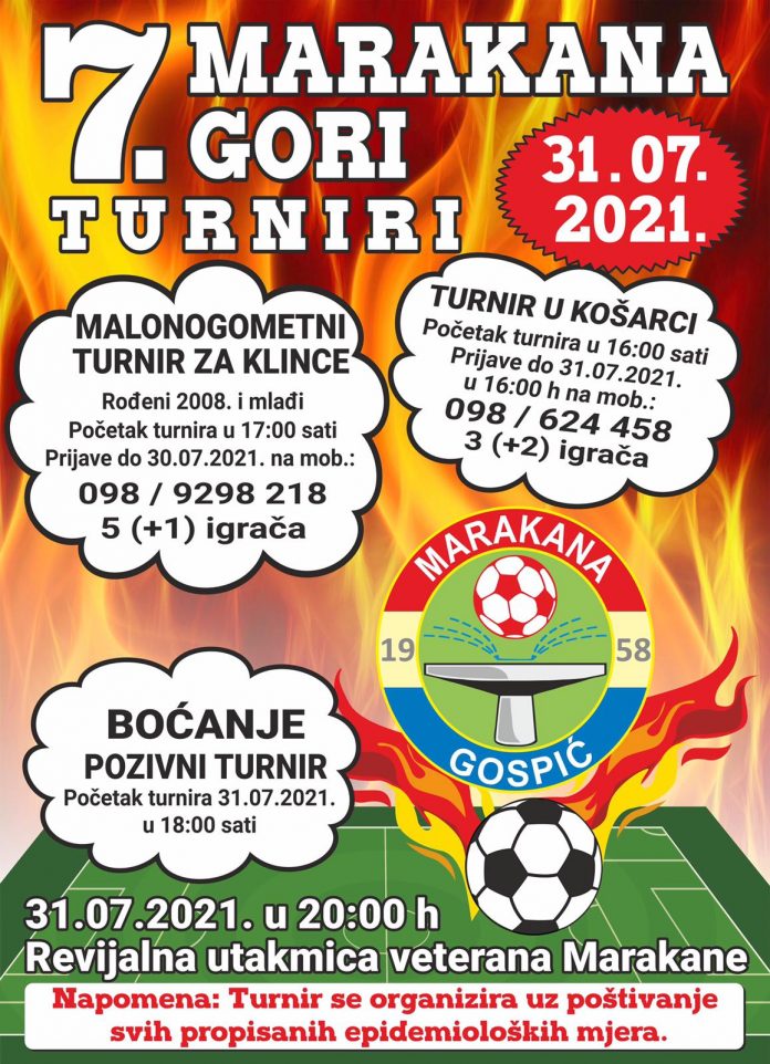 Udruga građana „Marakana Gospić“ obavještava sve da će se 31. srpnja (subota) u Gospiću održati tradicionalni turniri u organizaciji UG „Marakana Gospić“, a sve pod nazivom „7. Marakana gori“.