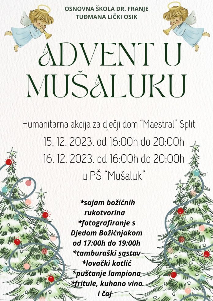 Osnovna škola dr. Franje Tuđmana Lički Osik u sklopu „Projekta Mušaluk“ i Volonterskog kluba Škole, već tradicionalno treću godinu zaredom organizira humanitarni Advent u Mušaluku.