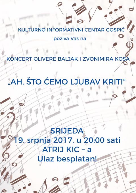 Povodom obilježavanja Dana Grada Gospića, Kulturno Informativni Centar Gospić organizira koncert Olivere Baljak i Zvonimira Kosa pod nazivom „Ah, što ćemo ljubav kriti“.