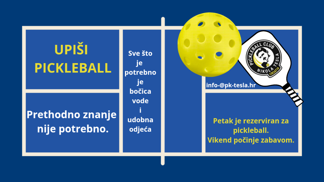 Za sve koji petak popodne žele provesti aktivno i opušteno, Pickleball club Nikola Tesla Croatia nudi idealnu priliku – druženje, smijeh i rekreaciju uz sve popularniji sport: pickleball. Umjesto da tjedan završi ispred ekrana, građani su pozvani da se priključe ovoj zabavnoj aktivnosti koja spaja pokret, dobru energiju i zajedništvo.