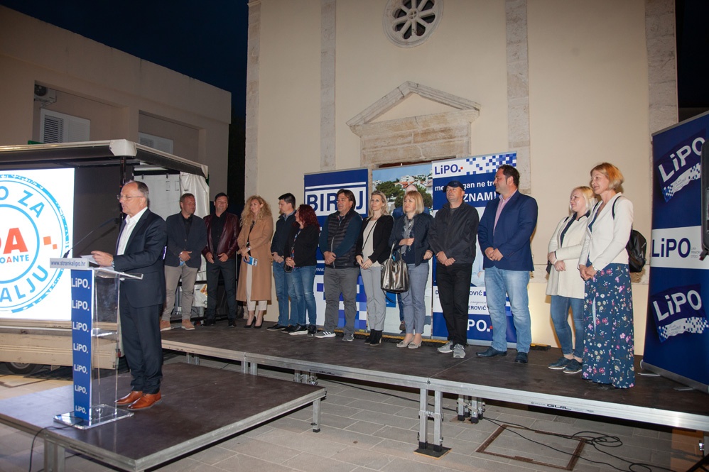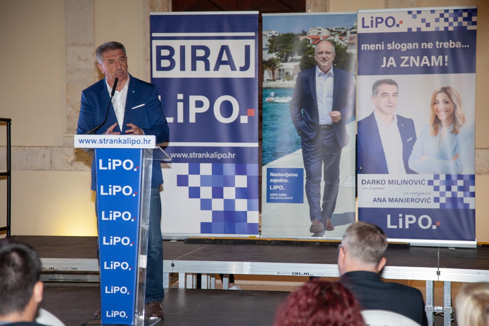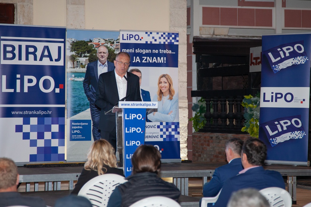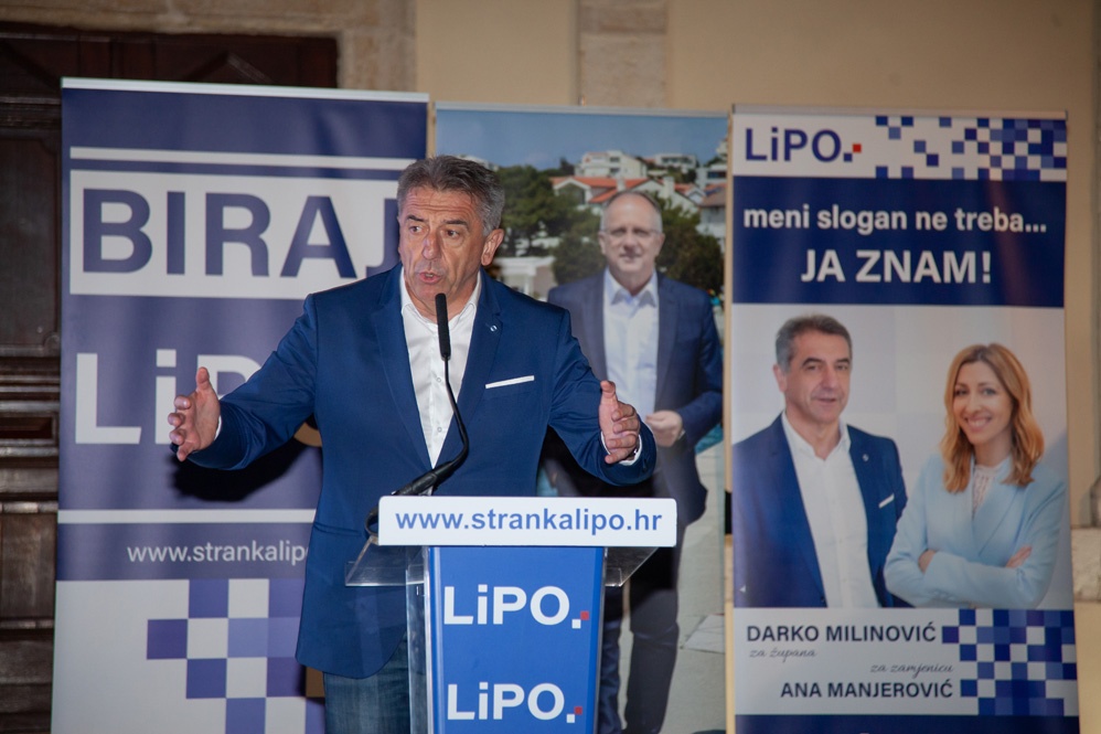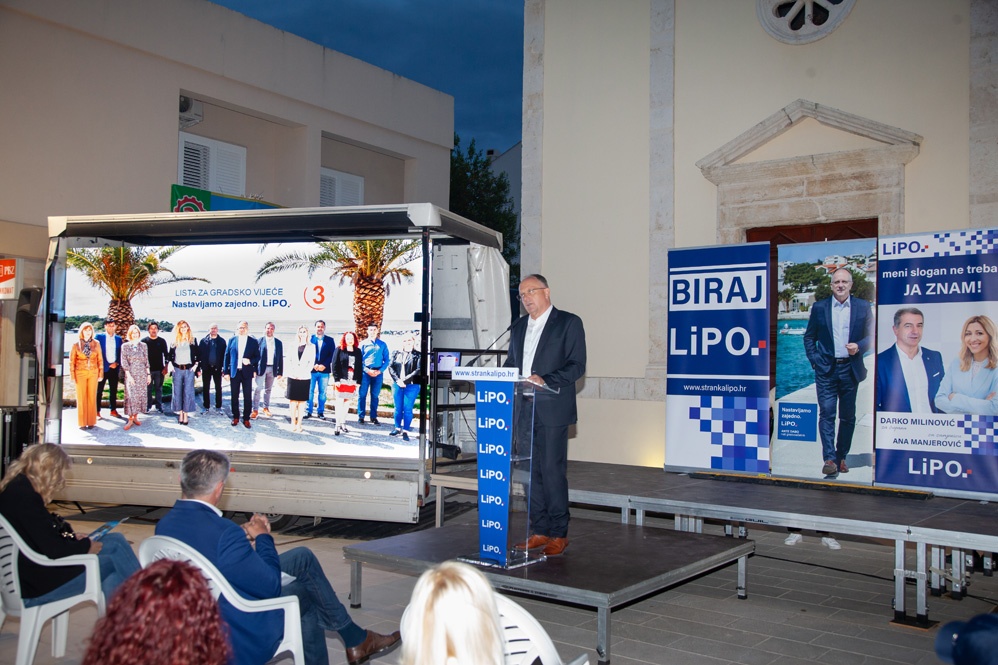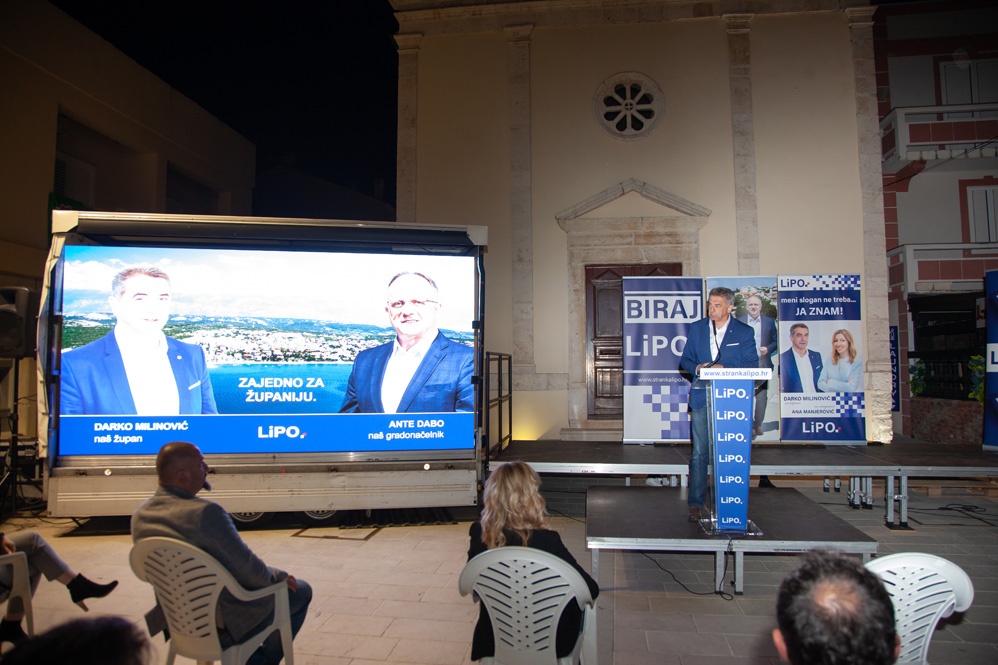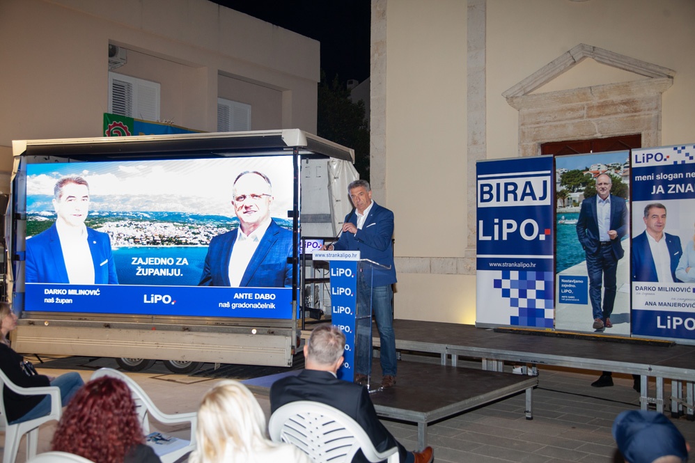 Ča van se čini, kako ovaj likota, vaš župan, vašim dijalektom, vašim srcem voli Novalju, započeo je govor predsjednik stranke LiPO Darko Milinović i dobio zbog novaljskog dijalekta ovacije. „Voditeljica Ana upitala je kada je ona recitirala ovu pjesmu, sto politika ima s poezijom,“ rekao je Milinović. „Ima, ima,“ obratio se Milinović Ani,“ kada tu poeziju piše najjača politička stranka u Ličko-senjskoj županiji stranka LiPO. Mi smo kao poezija iz razloga što se nismo okupili i nismo stvorili najjaču političku stranku na platformi protiv bilo koga već na platformi okupljanja i zato danas imamo gotovo 2,5 tisuće članova. Meni slogan ne treba, ja znam da Ante i ja idemo zajedno do pobjede u nedjelju ,“zaključio je Milinović.