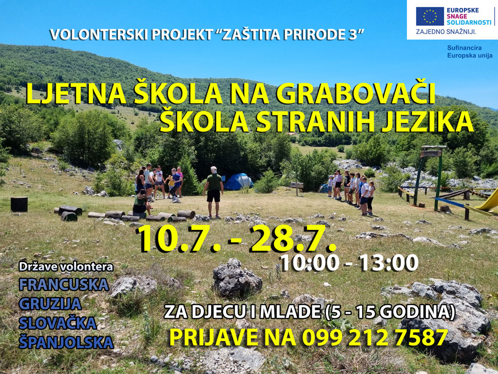 Neka i ove godine vaša djeca provedu aktivne i nezaboravne praznike na besplatnoj Ljetnoj školi na Grabovači, od 10. do 28. srpnja! Volonteri projekta “Zaštita prirode 3”, financiranog iz programa Europskih snaga solidarnosti, dolaze iz čak četiri države, a za djecu je u ponudi i škola stranih jezika: francuskog, gruzijskog, slovačkog ili španjolskog. U sklopu Ljetne škole, 12. srpnja, sudjeluju i mladi belgijski izviđači, koji će djeci, volonterima i zainteresiranima prezentirati izviđačke aktivnosti i život u prirodi. Aktivnosti izvode volonteri, izviđači i djelatnici JU, a odvijaju se na području Pećinskog parka Grabovača, uz nadzor.