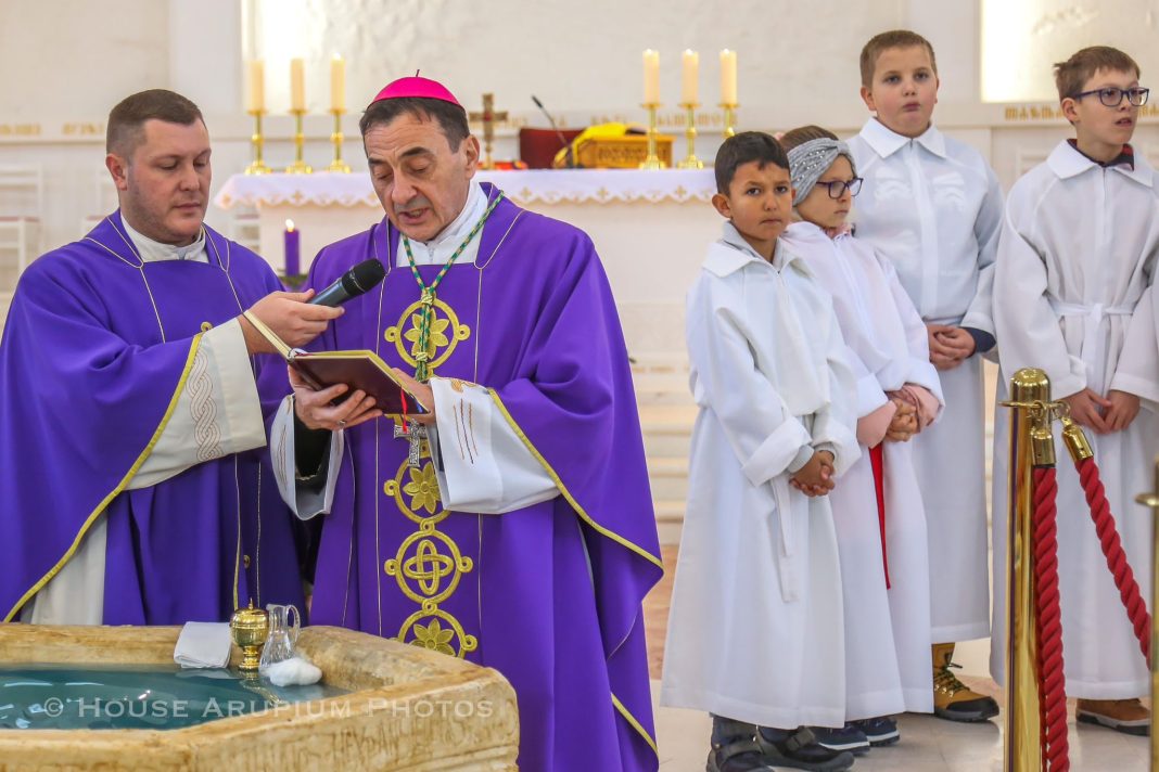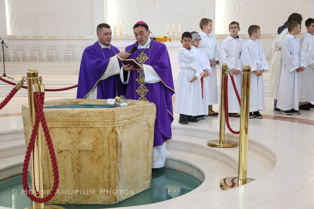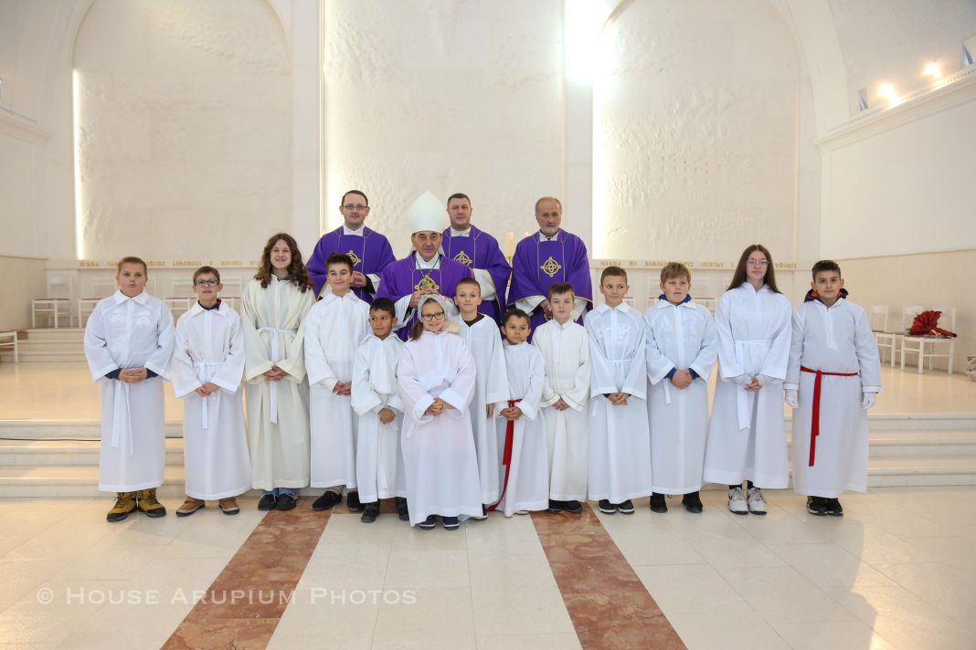A Marija? Marija se osjeća tako malena, nesrazmjerna. Što može reći? Marija vidi Božju dobrotu, Marija osjeća da ju je jedna ruka uzela i uzdignula u vis… jer joj oholost nije bila na teret. Marija je, dakle, dirnuta i izgovara najljepšu molitvu: ’Radujem se u Gospodinu! Neznatna sam/ malena, ali Bog me ljubi: sve dolazi od Njega!“ Biskup je čestitao obitelji Šolaja na otvorenosti životu te predivnom daru petog djeteta te im poručio da po krštenju maleni Jona postaje blagoslov za cijelu obitelj te da Bog na poseban način ulazi u njihove živote.
