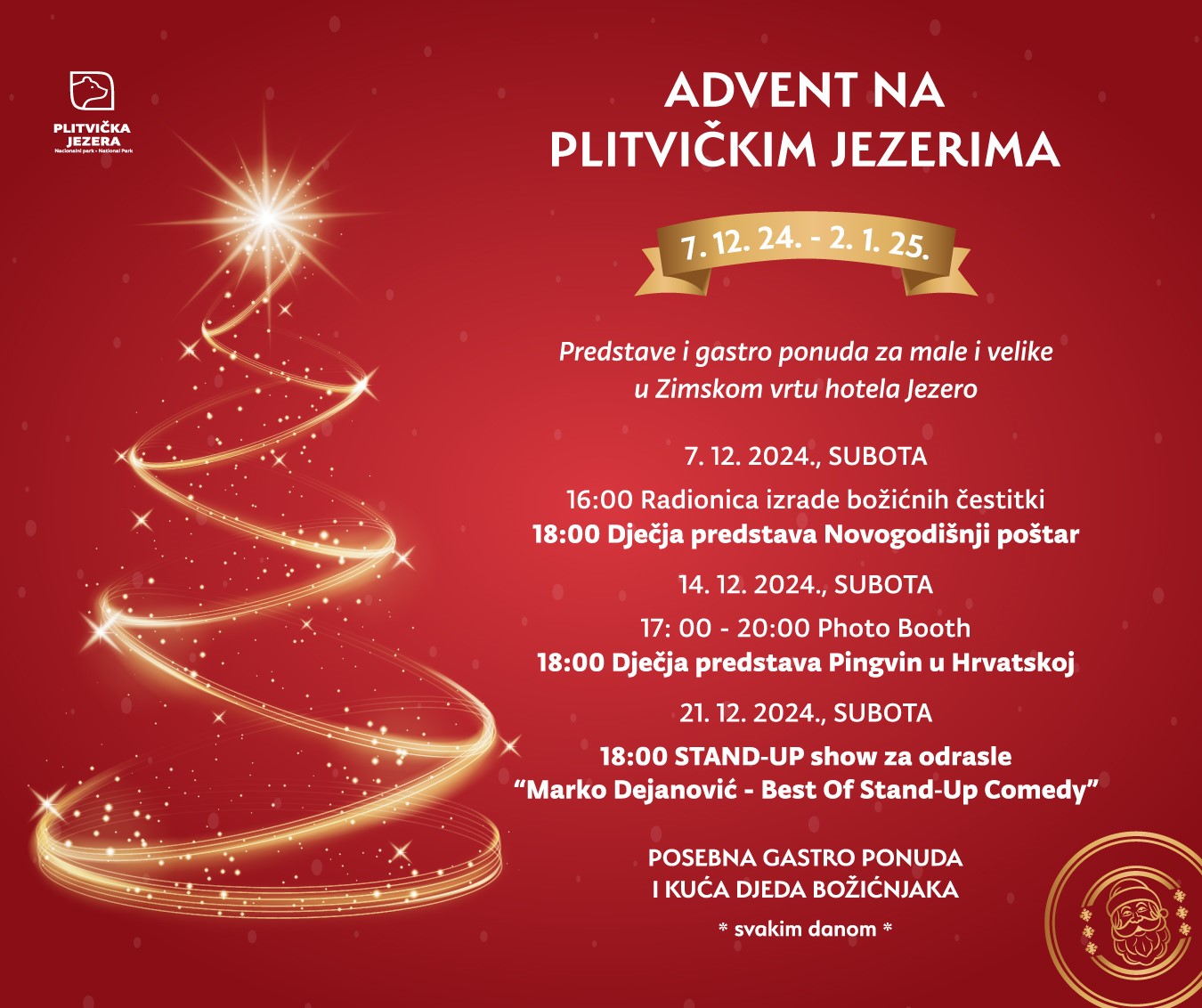 Adventska čarolija stiže na Plitvička jezera, a svi posjetitelji pozvani su da uživaju u posebnom zimskom ugođaju od 7. prosinca 2024. do 2. siječnja 2025. godine. Otvorenje ovogodišnjeg Adventa održat će se ove subote u Zimskom vrtu hotela Jezero, gdje posjetitelje očekuje bogat program i čaroban ambijent.