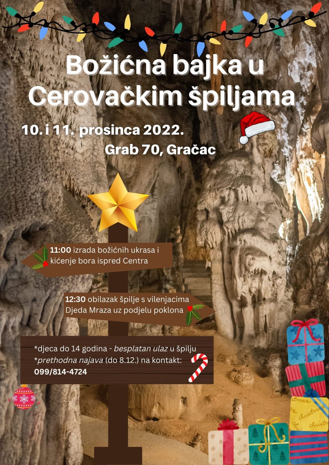 • 12:30 – obilazak Donje špilje s vilenjacima Djeda Mraza; susret s Djedom Mrazom u špilji i dijeljenje poklona!