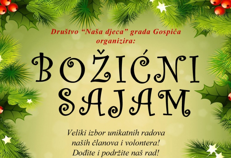 Udruga Društvo “Naša djeca” grada Gospića uputila je poziv na Božićni sajam koji će se održati u petak i subotu (11. i 12. prosinca) na trgu Stjepana Radića u Gospiću u vremenu od 9-16 sati.