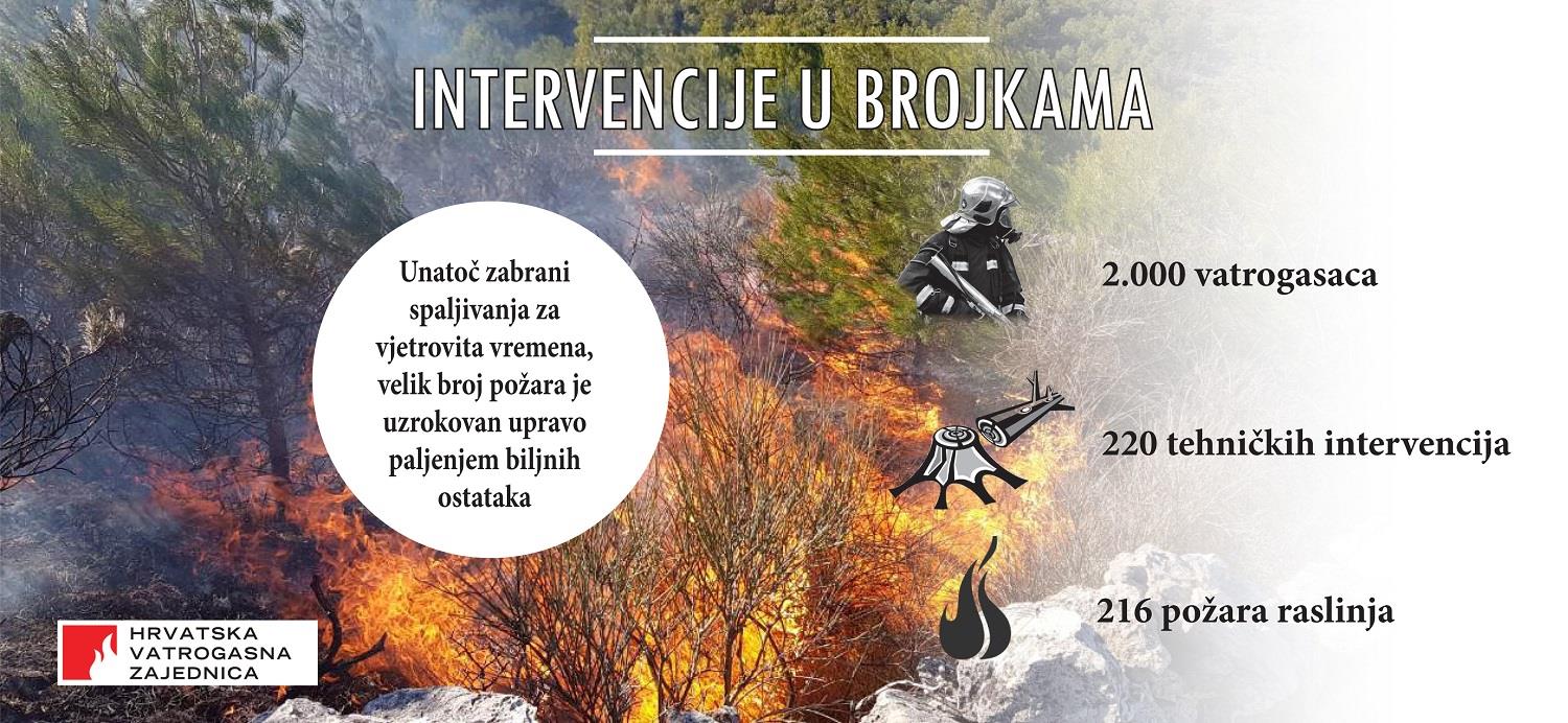 Pojačan broj intervencija nije zaobišao ni kontinentalni dio Hrvatske. Zabilježeno je 19 tehničkih intervencija u kojem je sudjelovalo 57 vatrogasaca te 67 požara raslinja sa opožarenom površinom od 377 hektara.