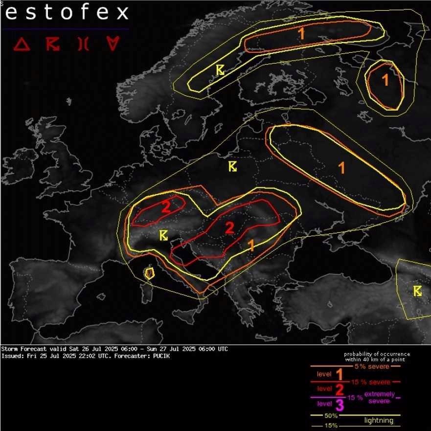 Jačanje i širenje olujnih sustava očekuje se s približavanjem ciklone i premještanjem fronte prema istoku. Dok su prve oluje moguće već sredinom dana, glavnina nevremena, posebno na području od Hrvatske do južne Slovačke, očekuje se u večernjim satima, nakon prolaska hladne fronte. Čak i tada, atmosfera će zadržati dovoljno energije za stvaranje jakih nevremena s tučom i olujnim vjetrom. Situacija je složena i razvoj oluja potrebno je pratiti tijekom cijelog dana kako bi se precizirale razine opasnosti za pojedina područja”, piše Estofex.