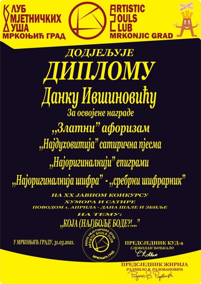 Na XX. Međunarodnom konkursu (čitaj natječaju) humora i satire „Aprilko šaljivko“ održanog 1. travnja u Mrkonjić-Gradu (BiH) na temu „KOJA (NAJ)BOLJE BODE?“ prestižnu književnu nagradu „Zlatni aforizam“ dobili su gospićki književnik, humorist i aforist Danko Ivšinović s aforizmom: „WC koji ne smrdi na COVID miriše“ i banjalučki književnik Dinko Osmančević s aforizmom: „ Nije važno kolika je igla, važno je zadovoljiti pacijenta.“.