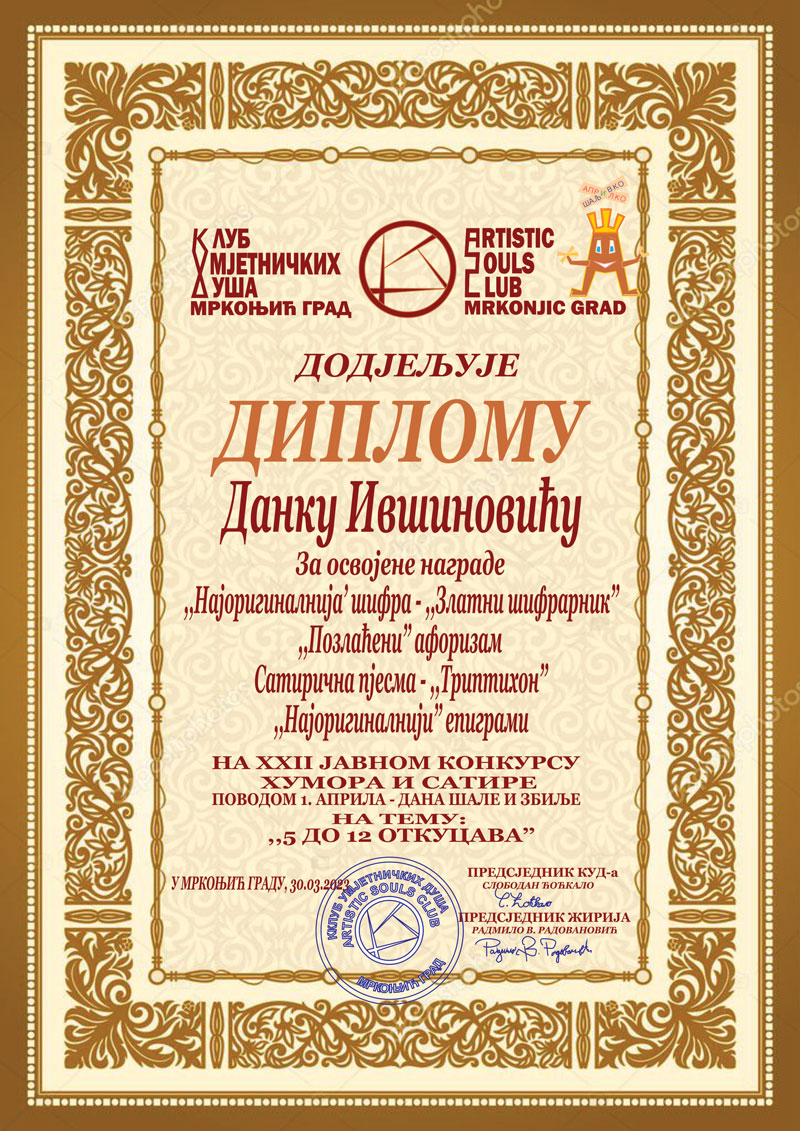 U organizaciji Kluba umjetničkih duša iz Mrkonjić Grada prigodom 1. travnja Dana šale na temu ” 5 Do 12 OTKUCAVA ” na XXII. Međunarodnom festivalu humora i satire gospićki književnik, pjesnik, aforist i humorist Danko Ivšinović i ove godine se okitio brojnim odličjima.