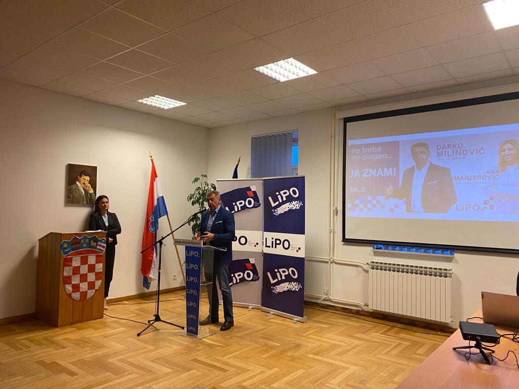 „ Mi smo stranka koja je stvorena na zdravim osnovama, mi smo stranka ponosa Ličko-senjske županije. Ovih dana neki naši članovi izvrgnuti su i prijetnjama. Vi imate predsjednika stranke koji to neće dopustiti. Uvjeren sam da Ivica Škrbina koji ima karakter, ponosni podlopčan, da će se vratiti svom čedu stranci LiPO i da neće podleći nikakvim pritiscima. Imate župana s karakterom kojem ne treba slogan, župana koji je spreman pljeskati svakom onom koji napravi dobro za ovu županiju ali i zviždati kada nas pokušavaju omalovažavati. U tom trenutku u dvorani je nastao tajac, na skup je došao Ivica Škrbina i Milinovića ostavio bez riječi ali samo na trenutak.