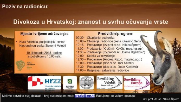 U sklopu istraživačkog projekta Hrvatske zaklade za znanost „DNA kao dokaz o distribuciji i vitalnosti ugrožene Balkanske divokoze; BalkCham” dana 10.listopada 2018. godine s početkom u 10.00 sati u prostorijama posjetiteljskog centra Nacionalnog Parka Sjeverni Velebit – Kući Velebita u Krasnu, Krasno 92 (multimedijalna dvorana na 2. katu) održat će se Znanstveno – stručna radionica Agronomskog fakulteta Sveučilišta u Zagrebu pod nazivom „Divokoza u Hrvatskoj: znanost u svrhu očuvanja vrste“
