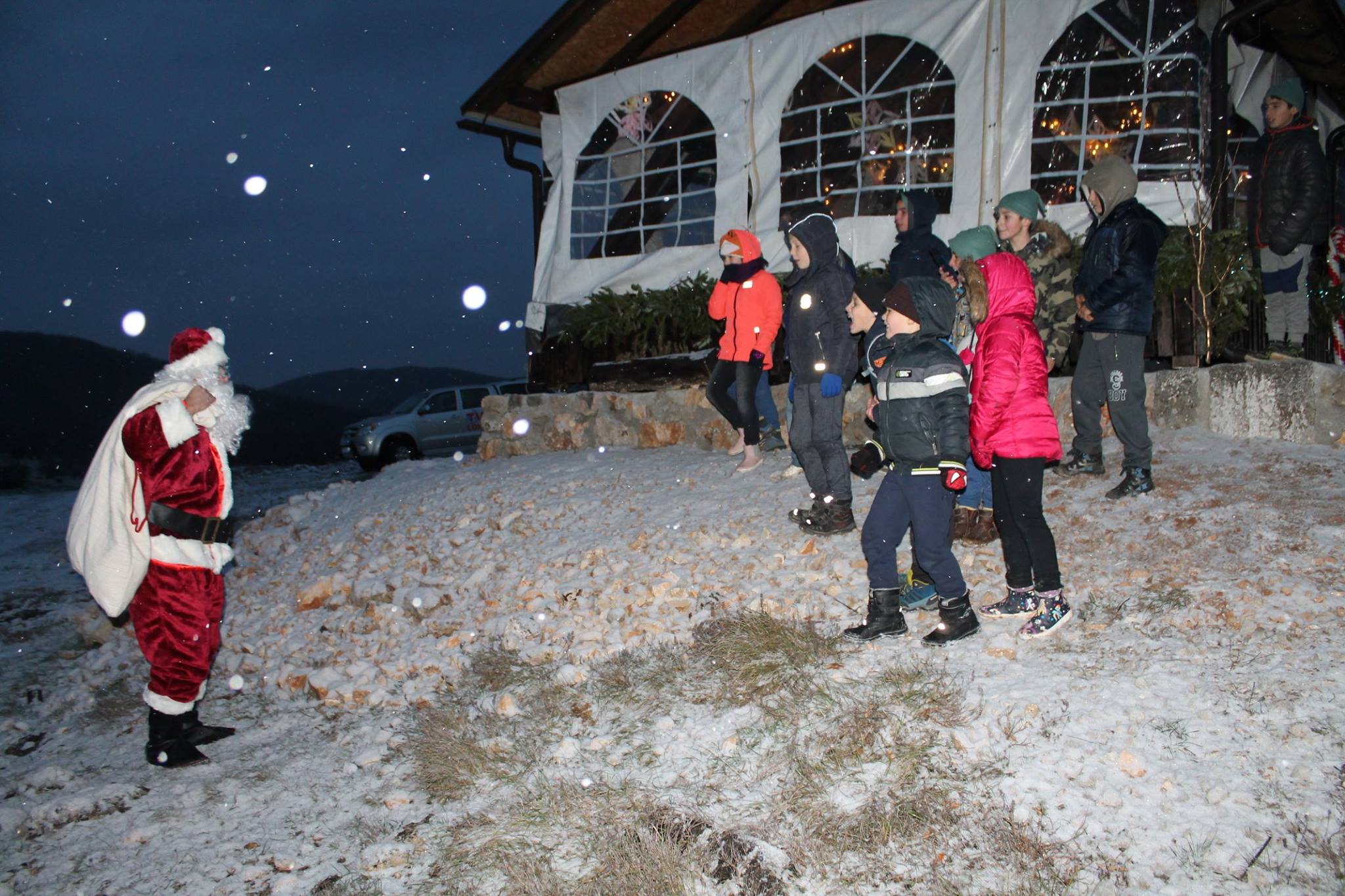 Mnoštvo radosne djece iz Perušića, Gospića, Ličkog Osika i Kosinja pohodili su danas selo Djeda Božićnjaka u Grabovači pored Perušića. Kod suvenirnice na ulazu u park postavljen je veliki šator gdje su djeca najprije sudjelovala u radionici i izrađivala božićne ukrase. Vrhunac veselja bio je dolazak Djeda Božićnjaka koji je ove godine bio doista poseban. Djedica s velikom torbom darova za mališane nije ove godine stigao uobičajenim prijevozom, nego se pojavio iz obližnjeg šumarka uz ono prepoznatljivo „ho-ho-ho“! Kao naručen, tada je počeo padati snijeg i dodatno uveličao ovu predivnu čaroliju. Nastala je dječja graja, smijeh i veselje jer je dobri djedica odmah počeo dijeliti darove. Pomagali su mu baka Mrazica i trojica vilenjaka. Uz mnoštvo kokica, kolača, kuhanih kobasica i lovačkog kotlića niti snijeg ove večeri nije bio veliki problem. Odrasli su se „zabavljali“ uz kuhano vino i kavu.