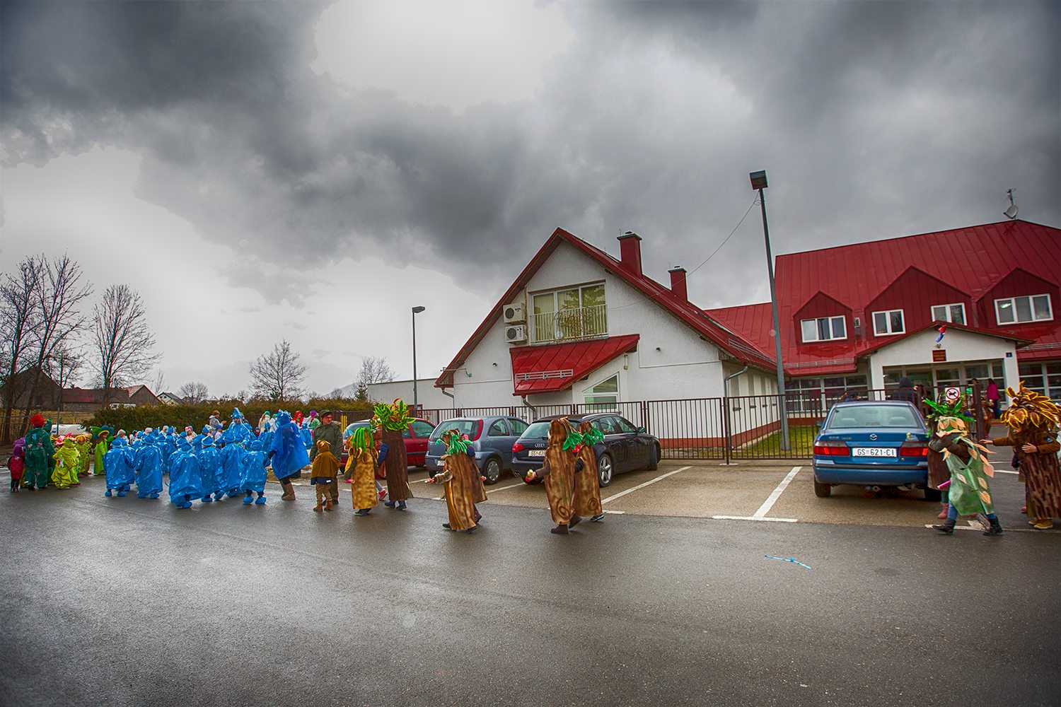 Tradicionalna maškarana povorka gospićkih mališana iz Dječjeg centra „Pahuljica“ Gospić  imala je danas ponešto promijenjen scenarij. Maskirana djeca krenula su ispred Dječjeg vrtića, napravila „đir“ po gradu, ali ih je dosadna kišica natjerala da se vrate u vrtić.