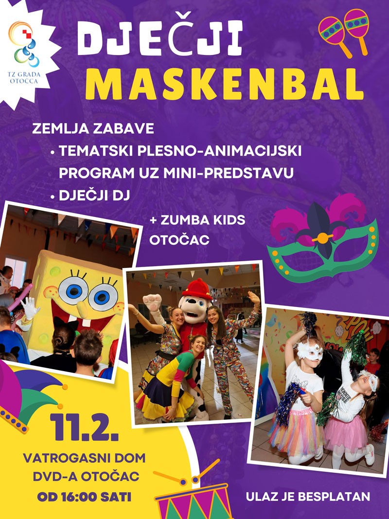 U nedjelju 11.  veljače Turistička zajednica Grada Otočca u suradnji s DVD-om Otočac organizira dječji maskenbal. Maskenbal će se održati u dvorani Vatrogasnog doma DVD-a Otočac s početkom u 16:00 sati. Za zabavu je zadužena ekipa iz “Zemlja Zabave” s tematskim plesno animacijskim programom, kostimiranim animatorima, mini predstavom te Dj-om. Uz njih svoje plesno ritmičke koreografije pokazat će nam naši najmlađi sugrađani članovi Zumba kids Otočac grupe. Ulaz je svima besplatan.