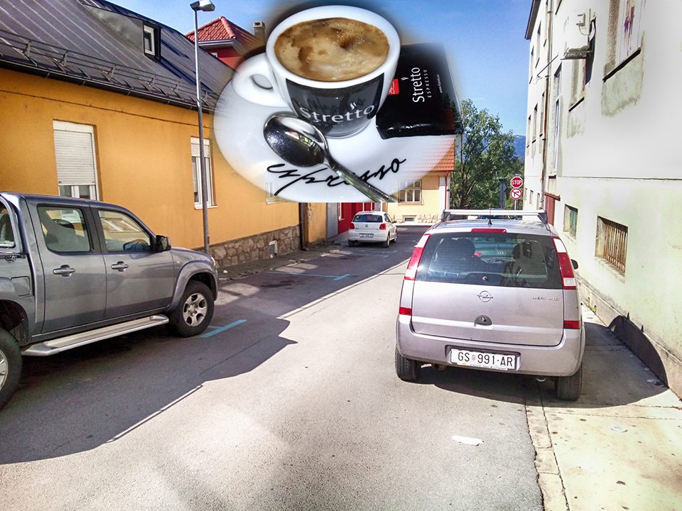Na slici je prikazan još jedan takav bahati prekršaj. U jednosmjernoj ulici u kojoj je označen i dopušten parking s lijeve strane, ovaj je lumen parkirao s desne strane ceste i pri tome još „zajašio“ na nogostup. Sreća njegova što Gospić još nema „pauka“ pa da bahati vozač svoj auto potraži na stovarištu i pri tome još plati i globu. Policija ga očito ne dira jer je „ravnopravniji“ od svih nas ostalih. Pouka ove priče glasi: Kada pijete kavicu najvažnije je s kim je pijete i s kime ste u dobrim odnosima. Zakoni i propisi u tome slučaju nevažna su sitnica. Još kada ste dobri s nekim „odozgo“ iz Policijske uprave, onda nema šanse da bi platili i najmanji prekršaj. Do kada, pitamo se mi obični smrtnici.