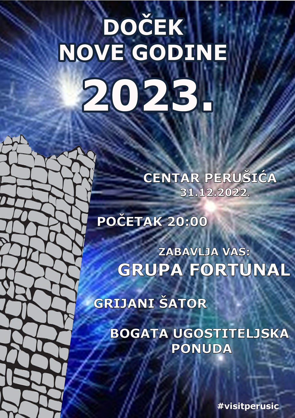 Nakon niza adventskih događanja godinu ćemo završiti organiziranim Dočekom u centru Perušića koji će započeti u 20:00 sati. Kako bi bili sigurni da će zabava potrajati do jutra postavit će se grijani šator. Posjetitelji će moći na toplome uživati u dobroj glazbi popularne grupe Fortunal te u bogatoj ugostiteljskoj ponudi.