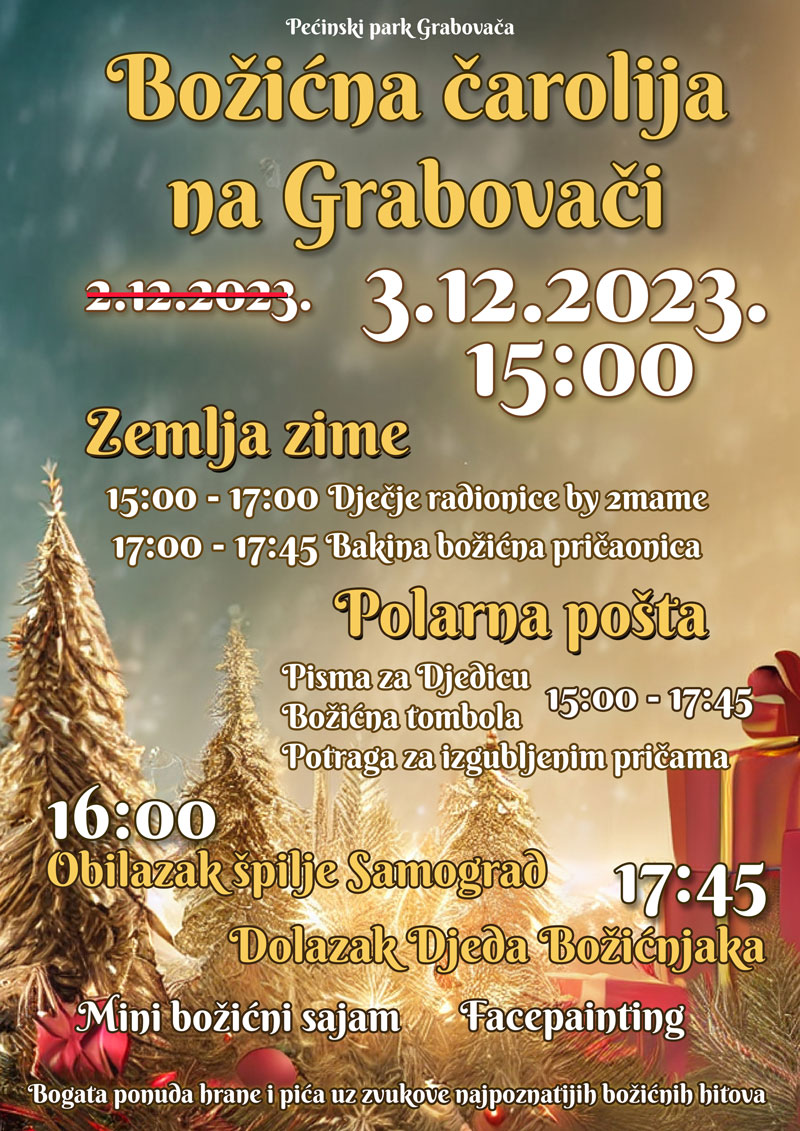 Zbog najavljene kiše u subotu, manifestacija Božićna čarolija se odgađa te će se održati u nedjelju, 3. prosinca 2023. s početkom u 15 sati! Očekuje Vas bogat program uz mnoštvo lampica, zabave i božićnih pjesama. Na Malom božićnom sajmu moći ćete se zasladiti domaćim kolačima i fritulama, a Kod Rudolfa se ugrijte uz toplo kuhano vino, kobasice u raznim varijantama, od kranjske do debrecinke. Osigurajte si nagradu kupnjom božićne tombole i stvorite nezaboravne uspomene fotografiranjem na posebno ukrašenim fotopunktovima. Kao i svaki put Čarolija donosi nove kutke, a ove godine to je Zemlja zime. Za najmlađe tu je još i Potraga za izgubljenim pričama (orijentacija u prirodi za djecu i mlade uz prigodne nagrade), dječje radionica by 2mame, Bakina božićna pričaonica i božićno oslikavanje lica. Djed Božićnjak podjelit će male, slatke poklone i spremno pozirati svim posjetiteljima! Sve svoje malo veće želje djeca će moći poslati Poštom Djeda Božićnjaka. Ne propustite i posljednji obilazak špilje Samograd u ovoj godini!
