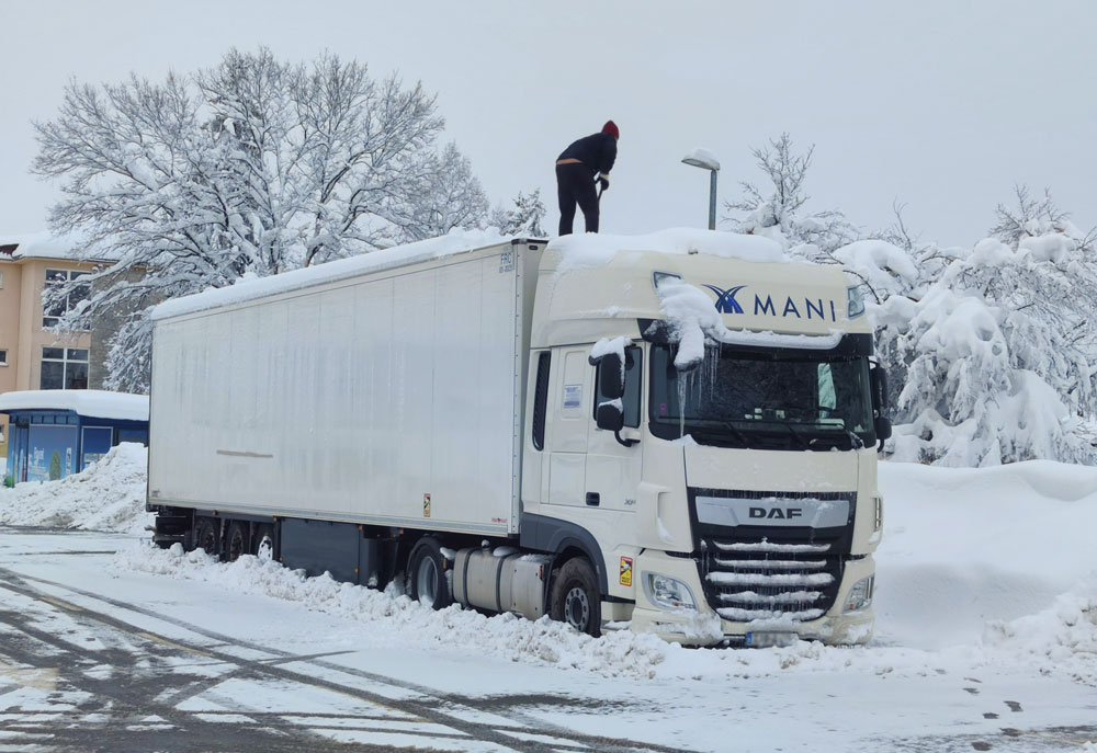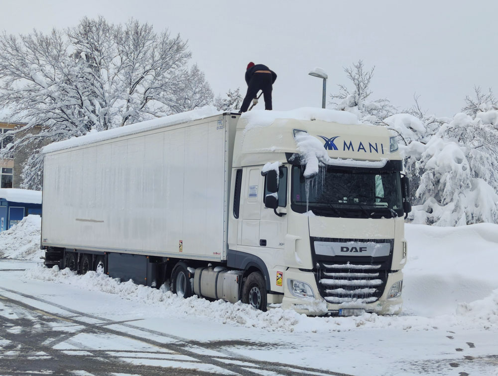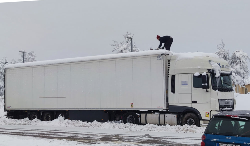 Ovaj mladić popeo se na kamion i sa njega uklanja bijeli balast. Kamion je parkiran negdje u Gospiću, ali kada je čovjek optimist, onda je sve lakše. Naime, kamion je BiH registracijskih oznaka, a sada mu je do kuće nedokučivo daleko. Na put mu valja pričekati još koji dan.