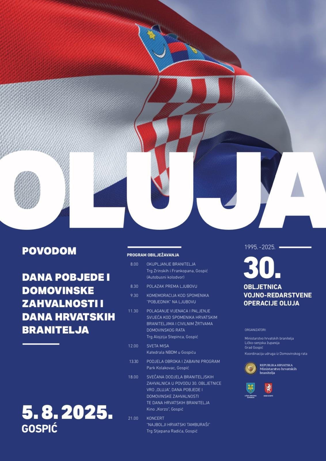 Gospić će u utorak, 5. kolovoza 2025., svečano obilježiti Dan pobjede i domovinske zahvalnosti, Dan hrvatskih branitelja te 30. obljetnicu vojno-redarstvene operacije Oluja. Program počinje u 8 sati okupljanjem branitelja na Trgu Zrinskih i Frankopana (autobusni kolodvor), nakon čega slijedi polazak prema Ljubovu. U 9.30 sati predviđena je komemoracija kod spomenika „Pobjednik“ na Ljubovu.