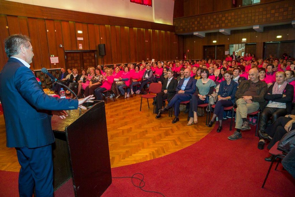 -U Gospić su nam danas došle žene iz cijele Hrvatske i zato sam ponosam što mogu reći da je Gospić danas naš najljepši grad. Ne znam s koje pozicije bih govorio. Kao ginekolog, sin, suprug ili otac. Cijeloga života sam okružen ženama i na to sam ponosan. Od srednje Medicinske škole, preko fakulteta i specijalizacije pa do ginekologa. U mojem mandatu ministra zdravstva neke su medicinke sestre postale pomoćnice ravnatelja. Naša bolnica je korak mjesta od centra, a tako „daleko“ kada treba otići na pregled. Ipak u Gospiću, kao i cijeloj Hrvatskoj imamo slab odaziv žena na kontrole vezane uz rano otkrivanje raka dojke ili ušća maternice. Kada nas ništa ne boli skloni smo ignoriranju preventivnih pregleda. Kao da se ono loše događa samo drugima, nikako nama. Ali kada i sami obolimo onda smo itekako svjesni važnosti preventivnih pregleda. Kao u društvo u cjelini moramo promijeniti te loše navike i ignoriranje ultrazvuka i mamografije. Dok smo se danas družili, u Europi je evidentirano 30 novih slučajeva raka dojke, a toga broja 10 žena je izgubilo bitku s tom bolešću. Zato moramo biti samosvjesni i disciplinirani jer ponavljam: ono loše se ne događa samo drugima-događa se svima nama, rekao je dr. Milinović prekidan učestalim pljeskom prepune dvorane učilišta.