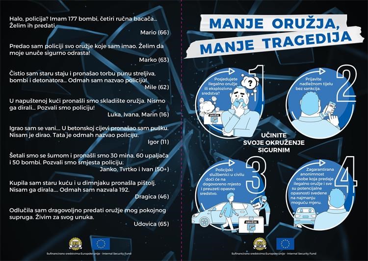 Pridružite nam se u akciji „Manje oružja – manje tragedija“ kojom je bez ikakvih sankcija omogućena dragovoljna predaja ilegalnih ubojitih sredstava i oružja. Protiv građana koji ovakvo oružje prijave nadležnom tijelu radi predaje, neće se pokretati prekršajni niti kazneni postupak.