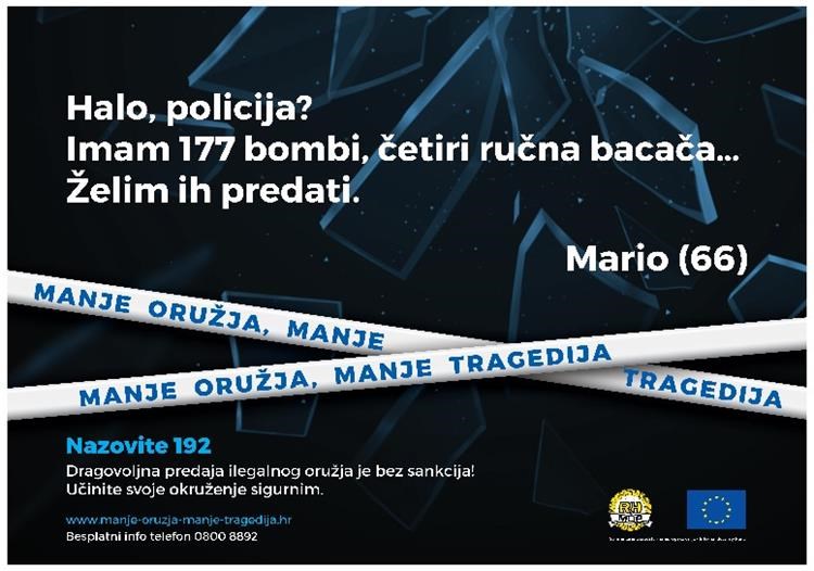 Sukladno Zakonu o nabavi i posjedovanju oružja građana, dragovoljna predaja ilegalnog oružja je bez sankcija, stoga apeliramo na sve građane koji još negdje u svojim domovima čuvaju ili skrivaju ilegalno oružje ili eksplozivna sredstva da pozivom na broj 192 učine prvi korak prema dragovoljnoj predaji oružja bez sankcija