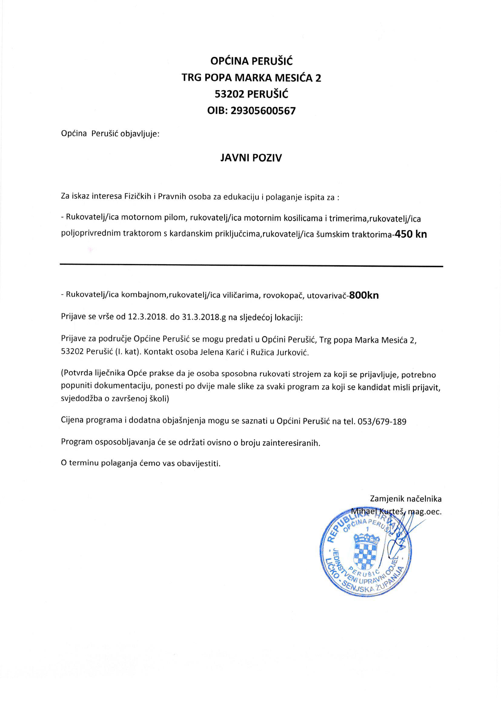 Općina Perušić uputila je još jedan Javni poziv za iskaz zanimanja pravnih i fizičkih osoba za edukaciju. Ovoga puta edukacija je podijeljena u dva dijela, od kojih se jedan odnosi na rukovatelje motornom pilom, kosilicama, zatim rikovoditelje poljoprivrednim traktorima s kardanskim priključcima i šumskim traktorima. Cijena edukacije i polaganja tečaja je 450 kuna.