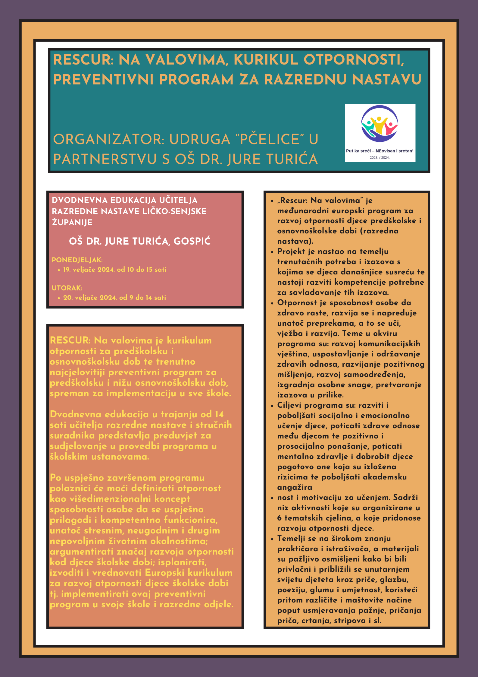 Udruga „Pčelice“ poziva sve zainteresirane učitelje razredne nastave i stručne suradnike osnovnih škola na području Ličko-senjske županije na dvodnevnu edukaciju za provedbu preventivnog programa RESCUR: Na valovima otpornosti. Edukacija će se održati u OŠ dr. Jure Turića u Gospiću. Edukacija počinje u ponedjeljak, 19. veljače 2024. u 10 sati. Edukaciju provode Katarina Sikirić Lukić, mag. paed. soc., Jelena Petković, mag. paed. soc., Mattea Radoslović, mag. paed. soc. i Marija Zdunić, dipl. soc. pedagog, trenerice za preventivni program RESCUR. Za sada je slobodno još 20 mjesta, a prijave za edukaciju vrše se putem stranice Agencije za odgoj i obrazovanje za stručna usavršavanja (ettaedu.azoo.hr). Više o samo programu i edukaciji možete saznati na plakatu.