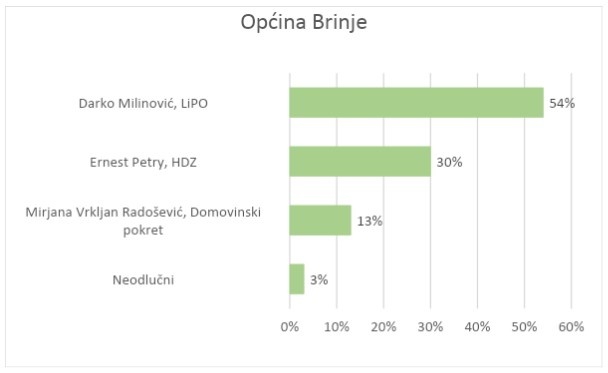 Kandidat stranke LiPO Darko Milinović po tim anketama u Brinju dobiva 54 % glasova, kandidat HDZ Ernest Petry dobiva 30 % glasova, kandidatkinja Domovinskog pokreta Mirjana Vrkljan Radošević dobiva 13% glasva te je neodlučnih 3 % ispitanika. Po ovome se vidi da je u  općini Brinje uvjerljivi favorit kandidat stranke LiPO Darko Milinović.