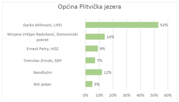 Zanimljivi rezultati postignuti su i u Plitvičkim jezerima. Kandidat stranke LiPO Milinović dobiva 53% glasova, kandidatkinja Domovinskog pokreta Mira Vrkljan Radošević dobiva 14 % glasova, kandidat HDZ-a Ernest Petry dobiva 9 % glasova, kandidata SDP-a Tomislav Zrinski dobiva 7% glasova dok je 12% neodlučnih i 5% neće glasati za nikoga od ponuđenih.