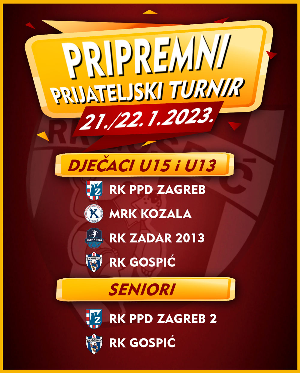 Kao što smo najavili slijedi nastavak do jučer nestvarne suradnje s velikim PPD Zagrebom. Ovog će vikenda dječaci U15 i U13 odigrati Prijateljski pripremni turnir s vršnjacima najtrofejnijeg Hrvatskog rukometnog kluba, MRK Kozala i RK Zadar 2013. Seniori Rukometnog kluba “Gospić” igrati će prijateljski susret protiv RK PPD Zagreb 2 i time imati idealnog protivnika za zagrijavanje na početku proljetnog dijela sezone. Satnicu donosimo uskoro!