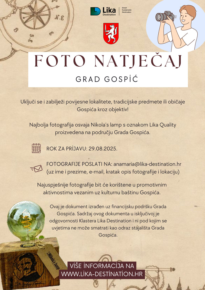 Klaster Lika Destination poziva sve građane i posjetitelje da se uključe u foto natječaj „Tradicijski tragovi Gospića“. Cilj natječaja je kroz fotografije prikazati bogatstvo lokalne kulturne baštine – od povijesnih lokaliteta do tradicijskih predmeta i običaja karakterističnih za Grad Gospić.