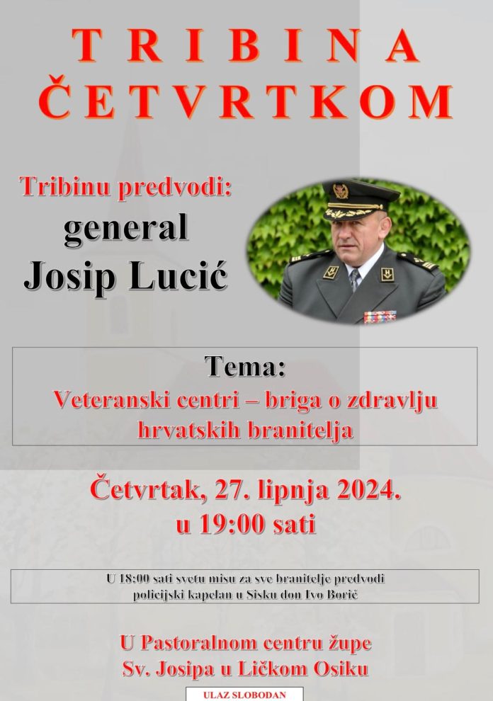 U četvrtak, 27. lipnja 2024. godine, u Pastoralnom centru sv. Josipa u Ličkom Osiku održat će se tribina na temu “Veteranski centri – briga o zdravlju hrvatskih branitelja”, a vodit će general Josip Lučić.