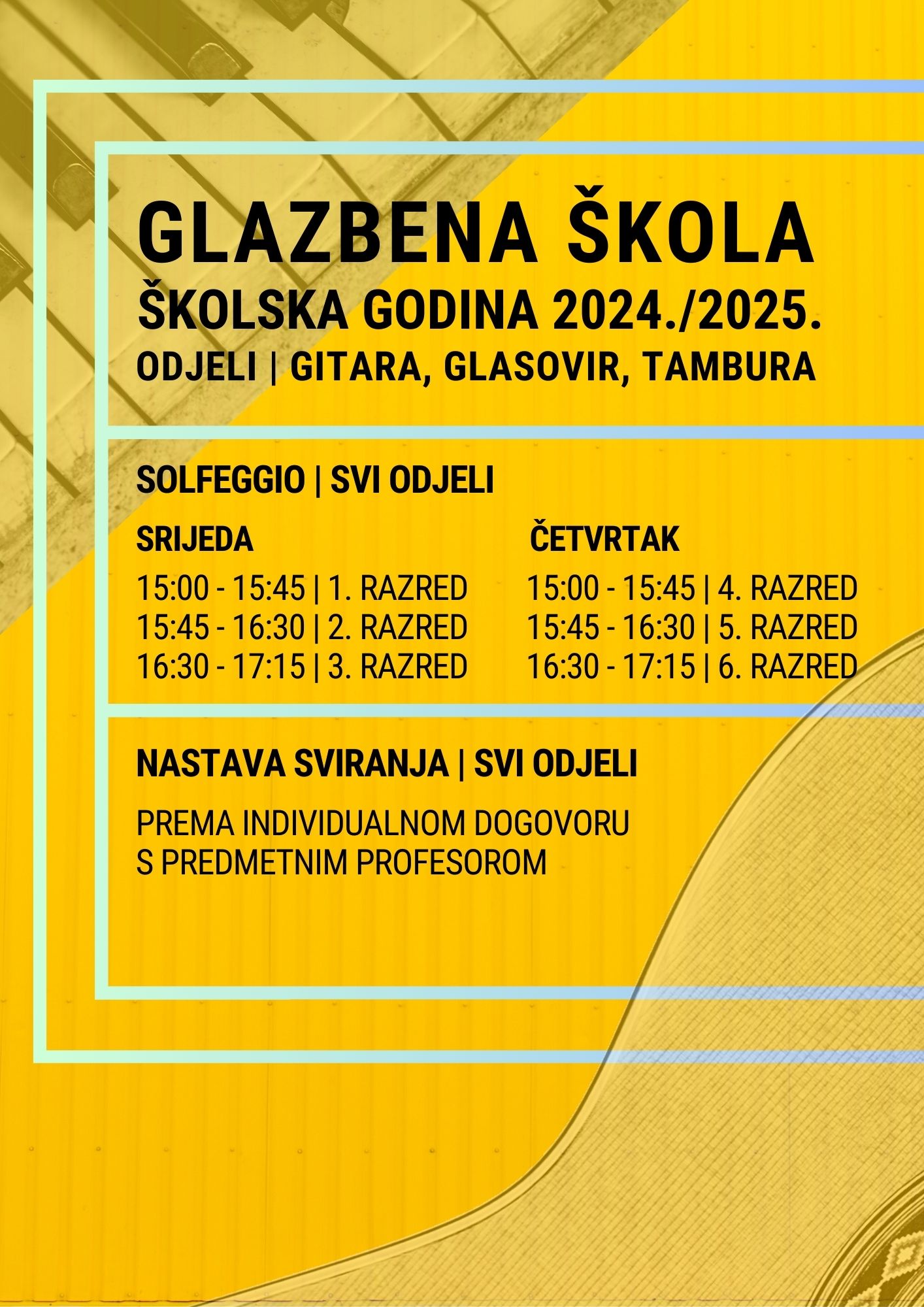 U prvi razred glazbene škole ove školske godine upisano je 10 novih učenika. Nastava sviranja organizira se prema individualnim dogovorima s predmetnim profesorima, dok se nastava solfeggia održava prema unaprijed određenom rasporedu. Tako će se nastava za prvi, drugi i treći razred odvijati srijedom u poslijepodnevnim satima, a za četvrti, peti i šesti razred četvrtkom.
