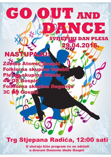 U organizaciji KIC-a Gospić, Osnovne škole dr. Jure Turić Gospić, Osnovne škole dr. Ante Starčević Pazarište Klanac, Zumba atomic Gospić i Društvom „Naša djeca“ Grada Gospića te u suradnji sa Plesnim centrom TALA (Zg) u okviru projekta „GO out and DANCE“ glavni gradski trg bit će ispunjen veselim ritmovima i plesnim koracima.