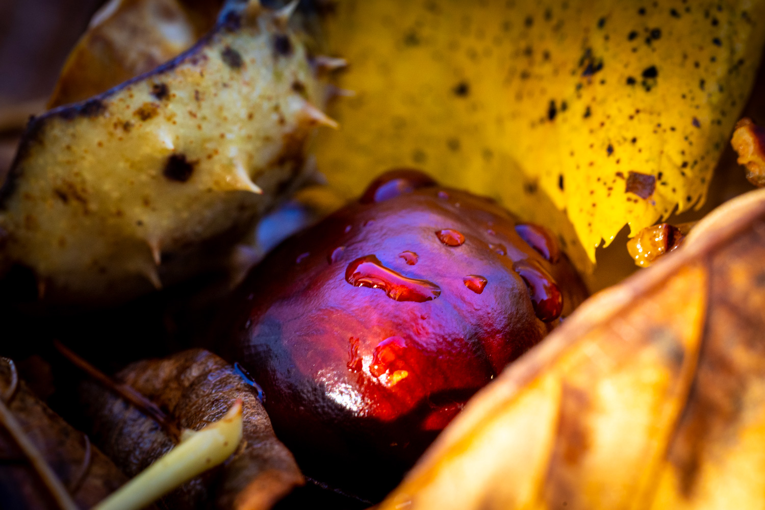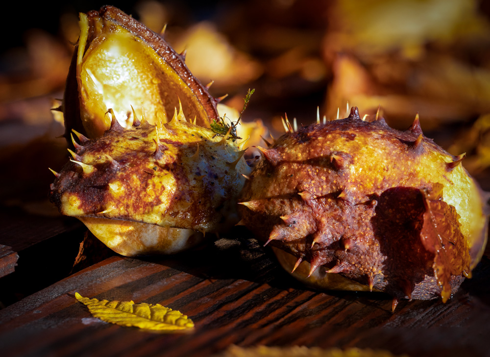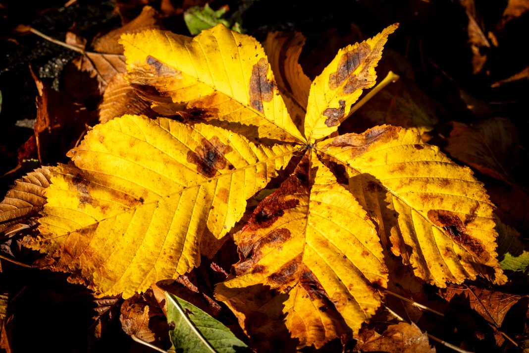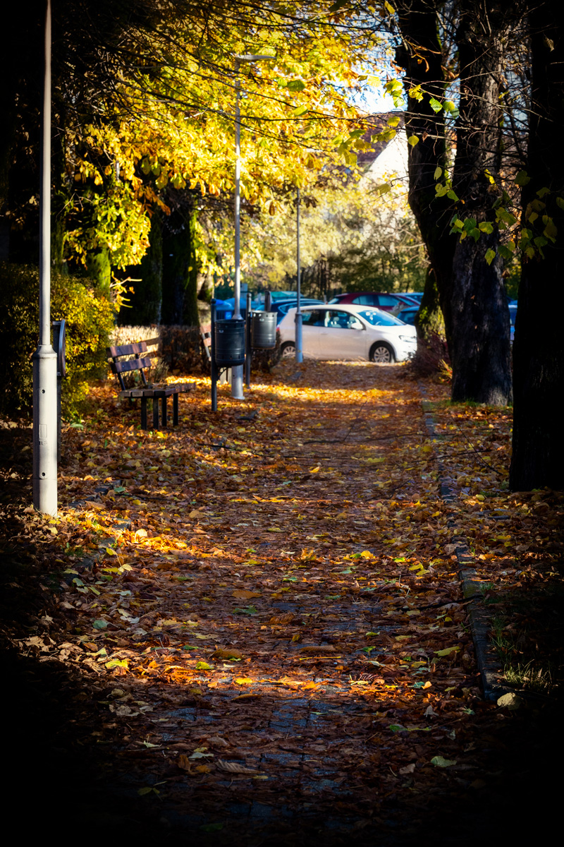 Jesen u Lici ima tišinu koja šušti pod nogama. Na jutros zabilježenim fotografijama na gospićkim ulicama lišće kestena stvara mek tepih, a nisko sunce povlači zlatne pruge preko staza. Nakon kiše sve se miriše jače: mahovina blista, sitni sporofiti strše poput minijaturnih svjetionika, gljive izviruju iz vlažne sjene, a koštice kestena pod kapljicama izgledaju kao sitni žeravni. Ulične klupe uronjene su u topli kolorit koji svaki kadar pretvara u razglednicu.