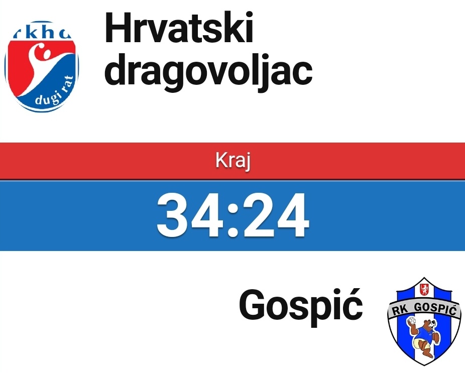 RK HRVATSKI DRAGOVOLJAC – RK GOSPIĆ 34:24 (19:15) – Seferagić (7), Petrović (5), Dželalija (4), Markić (3), Matulović (2), Jelić (2), Bilić (1)