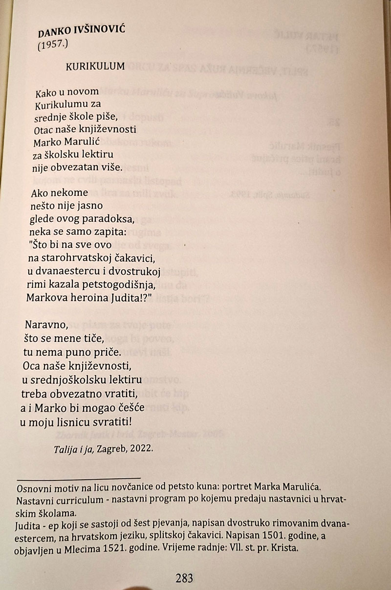 P.S. Inače, Ivšinovićeva protestna pjesama iz zbornika Kurikulum nastala je nakon što su nadležna prosvjetna tijela izbacila oca hrvatske književnosti iz obvezne srednjoškolske lektire jer je, valjda, prestar, kako ironično zaključuje briljantni pjesnik i aforist iz Gospića Danko Ivšinović, čiju pjesmu donosimo u cijelosti.