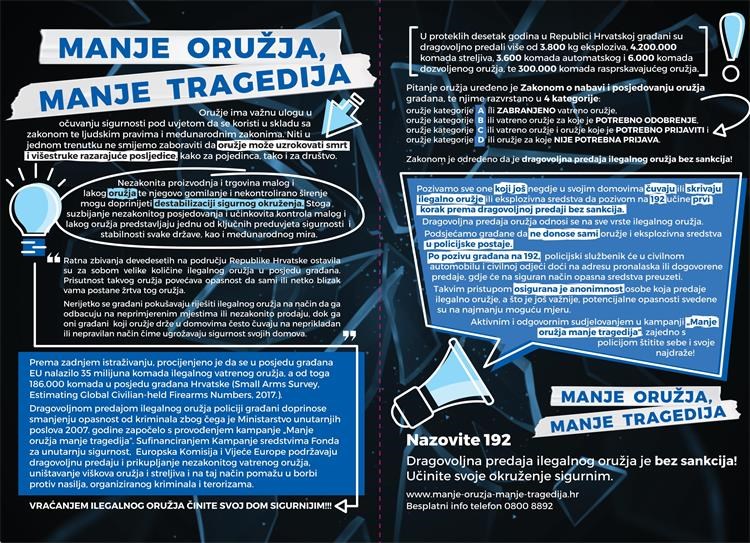 I ovom prilikom pozivamo građane da nam se pridruže u akciji „Manje oružja – manje tragedija“ kojom je bez ikakvih sankcija omogućena dragovoljna predaja ilegalnih ubojitih sredstava i oružja