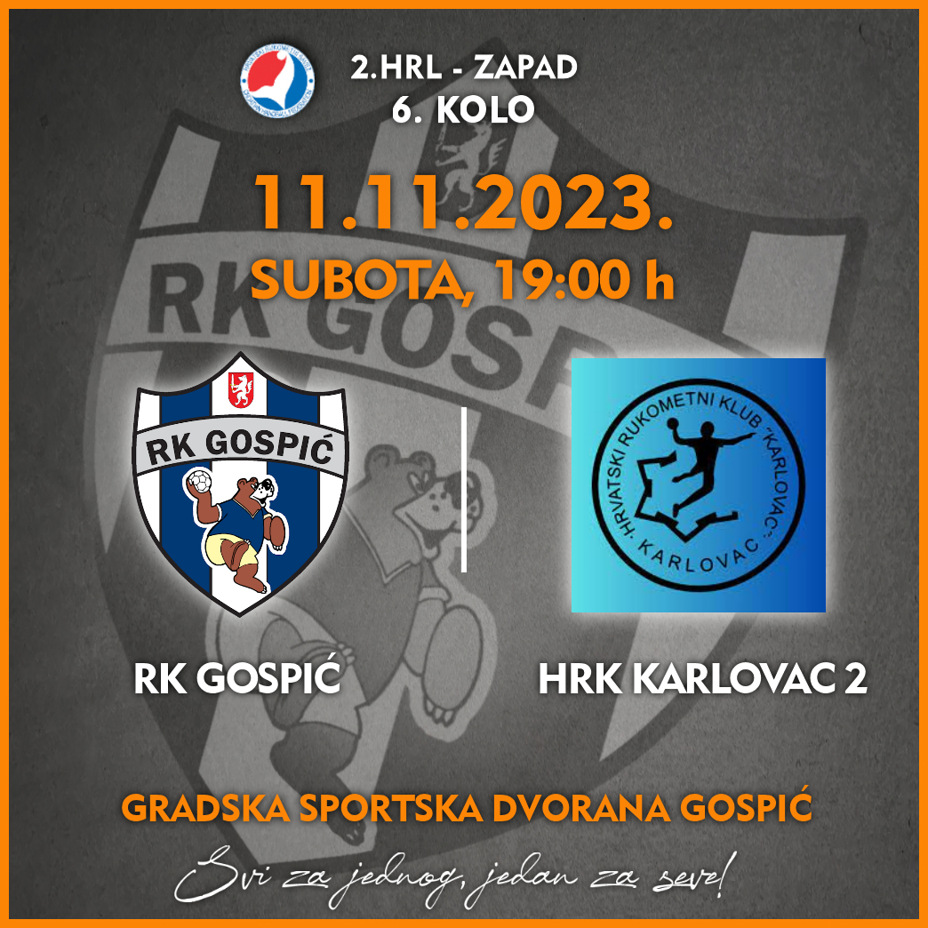 Utakmicu 6. kola 2. HRL Zapad seniorska ekipa Rukometnog kluba “Gospić odigrati će u Gradskoj sportskoj dvorani u Gospiću u subotu, 11. studenog 2023. godine, u 19 sati protiv ekipe Hrvatskog rukometnog kluba Karlovac 2