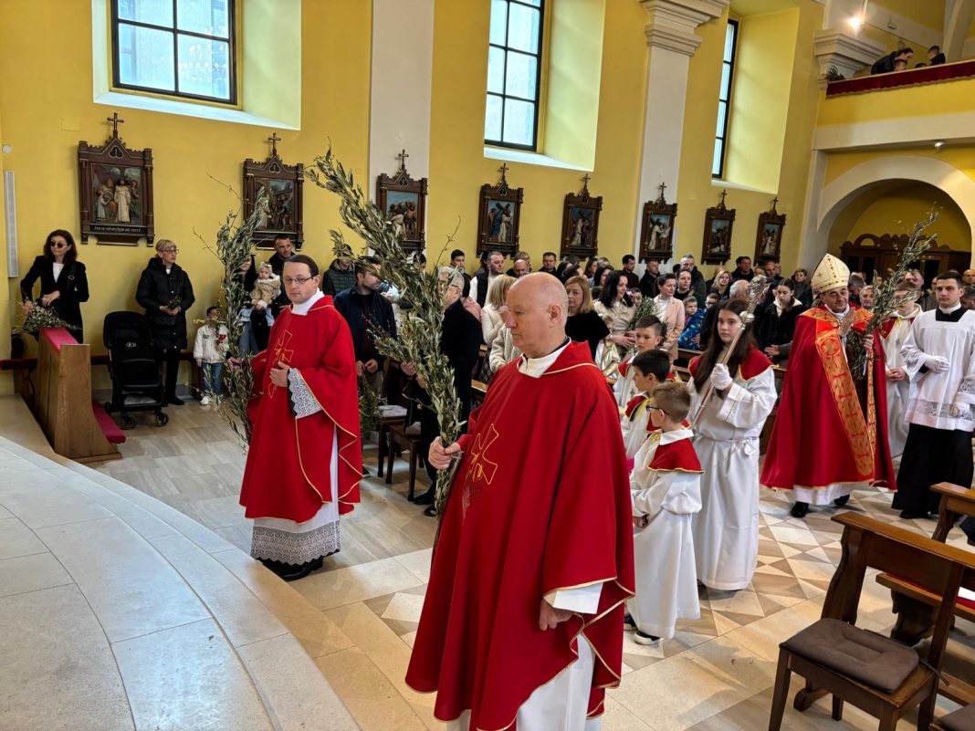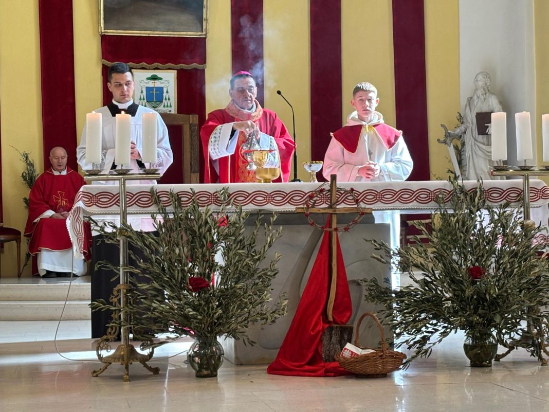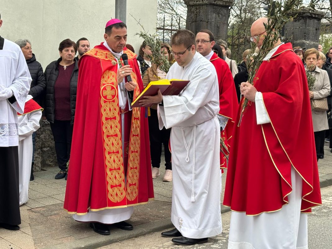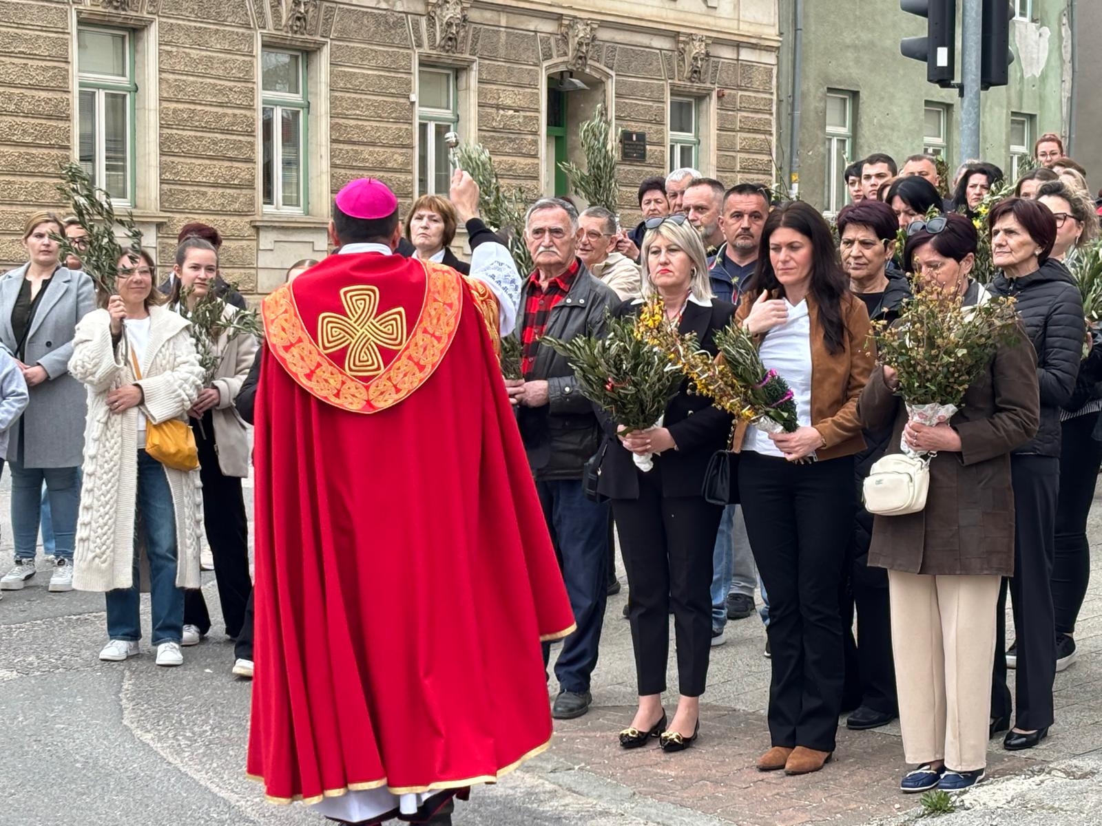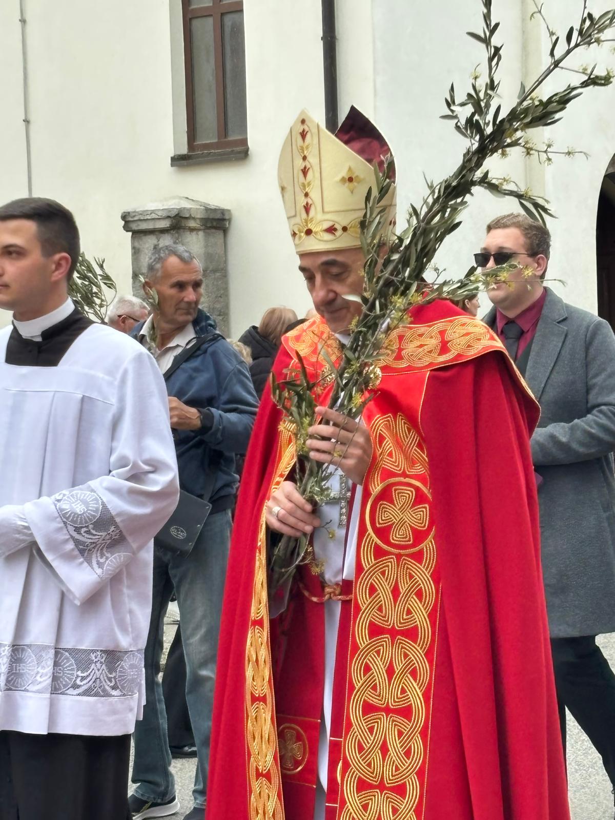 U svojoj homiliji biskup Medo, govoreći o događaju slavnog Isusovog ulaska u Jeruzalem, istaknuo je neodlučnost svjetine koja danas Isusu kliče, a sutra ga proklinje te se zapitao kakva je naša vjera i naš odgovor Kristu. Biskup je zatim rekao: „Danas gledamo Isusa kako ulazi u Jeruzalem: približio se Njegov čas, toliko iščekivani! Isus se pokazuje blag, dobar, miroljubiv, naizgled slab. Na takav način nas je naučio da je velika snaga svijeta dobrota: uistinu jak je samo dobar čovjek; uistinu jak je onaj koji je nadvladao nasilje u sebi; pobjednik je onaj tko daje svoj život za druge a ne onaj koji drugima oduzima život. Jesmo li prihvatili Njegovo učenje? Idemo li Njegovim putem?“ zapitao se biskup Medo.