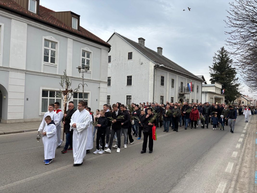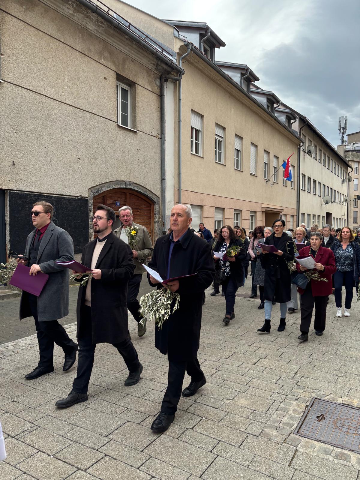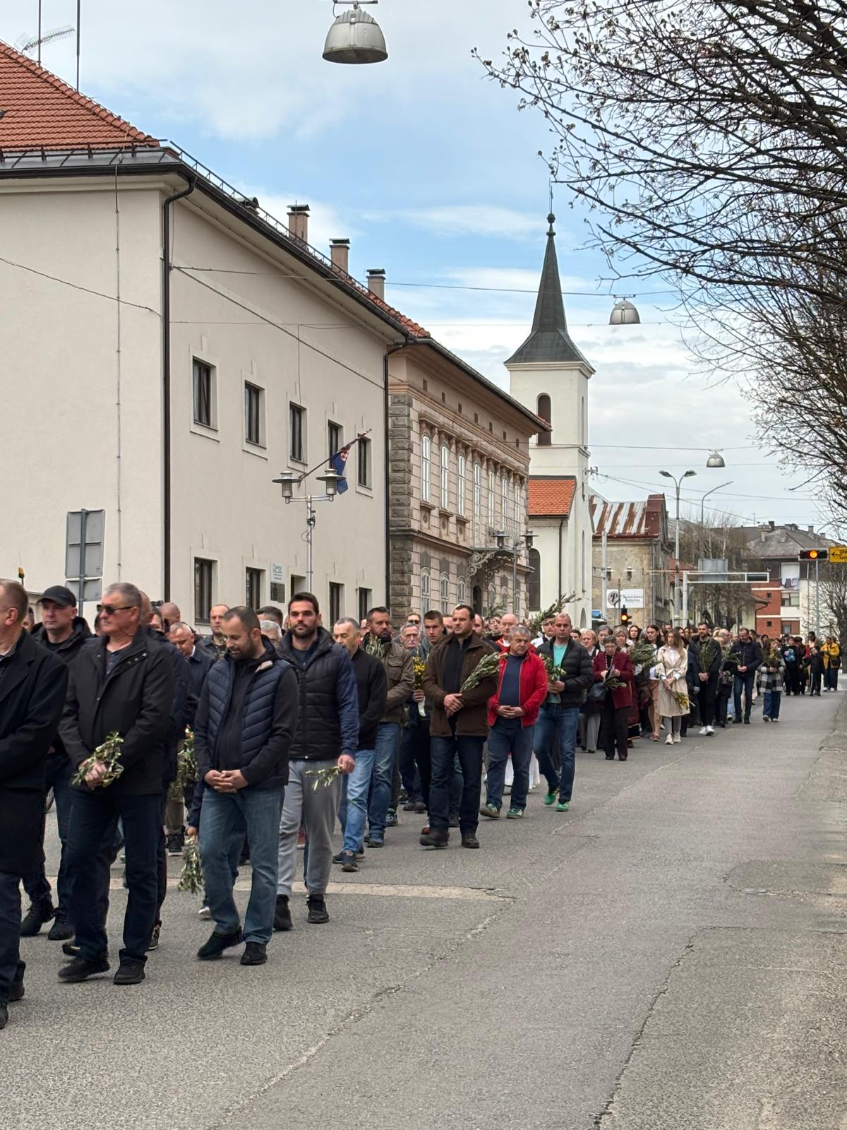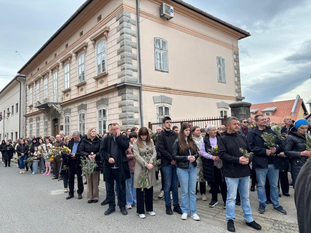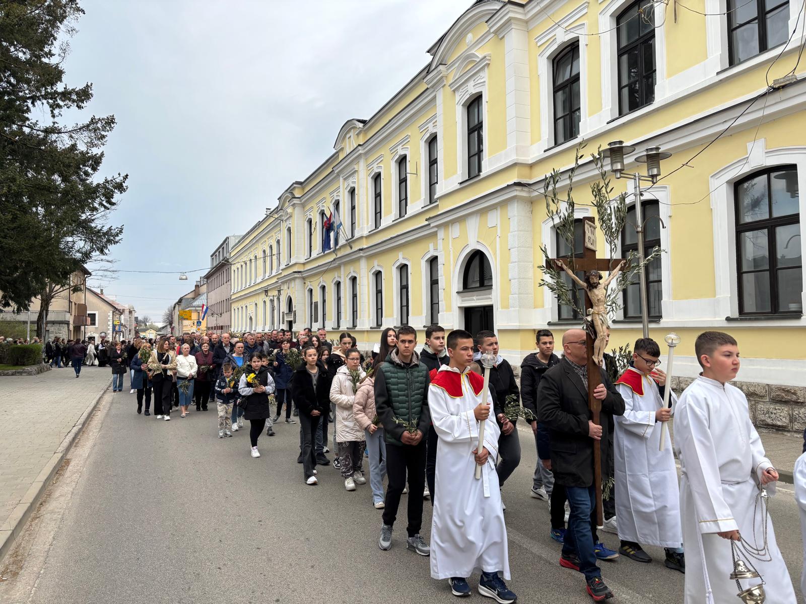 Vjernici su se okupili u 9.30 ispred crkve sv. Ivana Nepomuka gdje biskup Marko Medo u zajedništvu s kancelarom i tajnikom Mišelom Grgurićem i gospićkim župnikom Antom Kneževićem, uz asistenciju bogoslova Marka Butkovića i ministranata, blagoslovio maslinove grančice, drijen i prvo proljetno cvijeće odakle su u procesiji, pjevajući prigodne pjesme, predvođeni katedralnim zborom pod vodstvom Nikole Perišića, uputili se u katedralu.