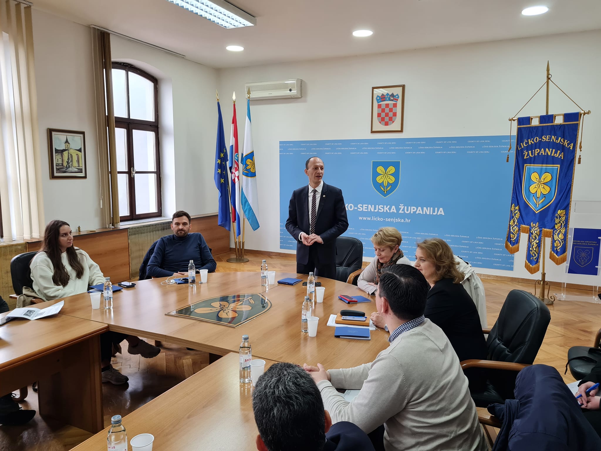 Goste je dočekao i uvodnim govorom pozdravio župan Ernest Petry koji je predstavio Ličko-senjsku županiju govoreći o njezinim prirodnim potencijalima i prednostima, gradovima i općinama, nacionalnim parkovima, planu razvoja, investicijama, razvoju turizma i poljoprivrede, zelenoj i digitalnoj tranziciji, proizvodnji električne energije iz obnovljivih izvora energije, a ujedno je istaknuo i činjenicu kako Ličko-senjska županija trenutno skrbi o trajno smještenih 668 ukrajinskih državljana, te 88 osoba na rubnom dijelu Karlovačke županije, što sveukupno čini 778 osoba od kojih su većina žene s djecom, koji su upravo na ovom području naišli na razumijevanje lokalnog stanovništva te u najgorim trenucima koji su ih zadesili u ratom pogođenoj Ukrajini u Ličko-senjskoj županiji pronašli svoj mir. Zaključno je svim nazočnima poželio dobrodošlicu i što kvalitetnije provedeno vrijeme u ovoj površinski najvećoj i najljepšoj županiji.